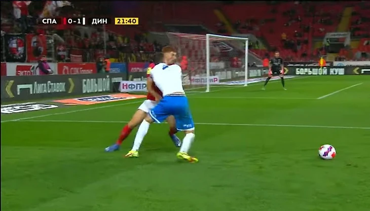 Еще Захарян специально подставляет свои ноги под идущего в атаку, пока, правда, без мяча, ведь он как-то, случайно оказался у Арсена, Кофрие. К сожалению, тут Карасев всё же лоялен к сопернику «Спартака».
