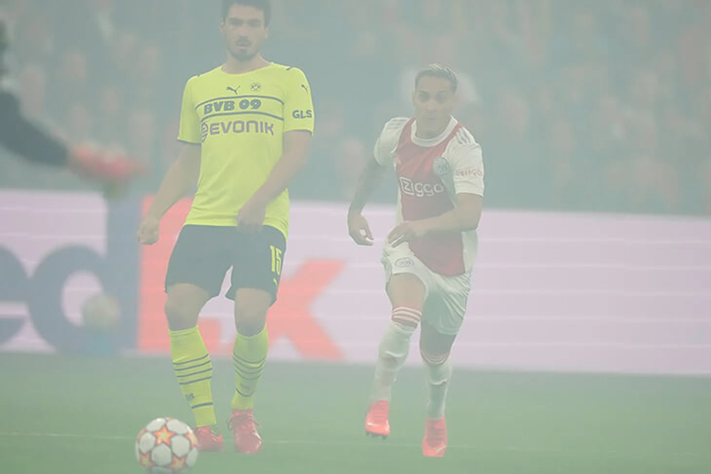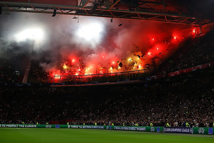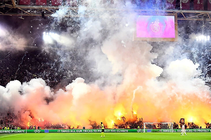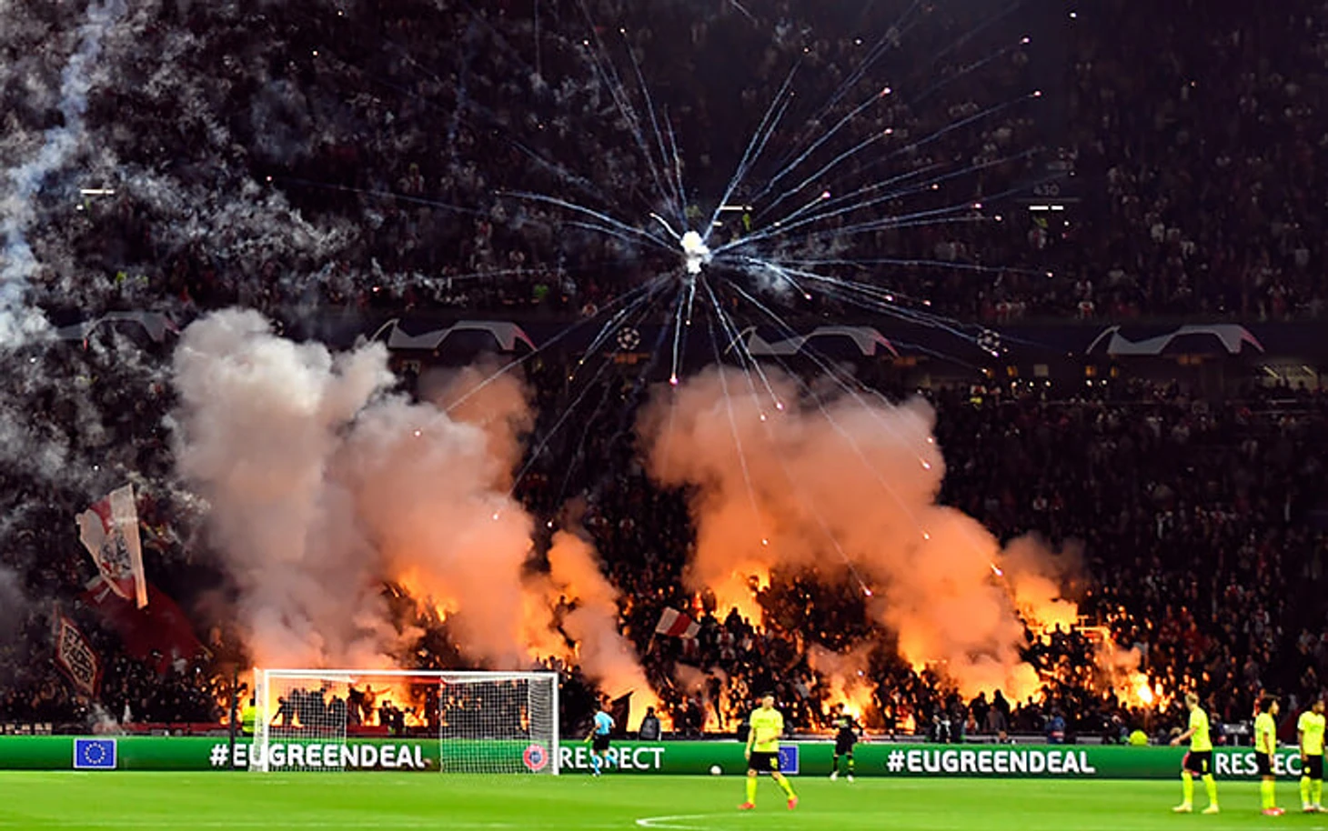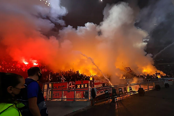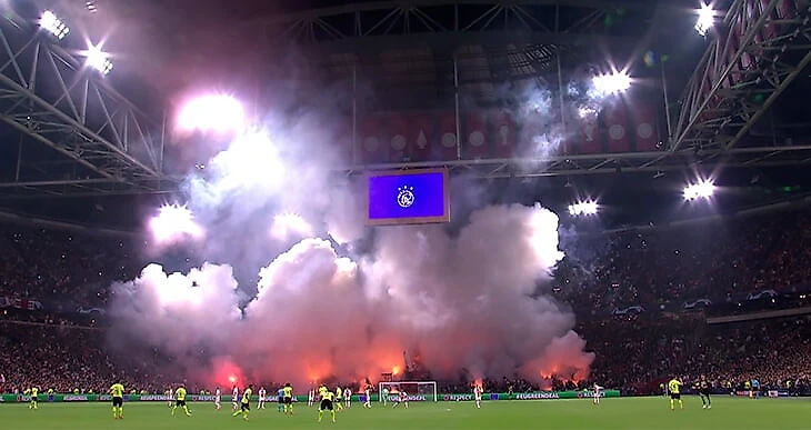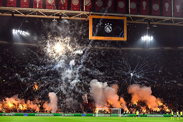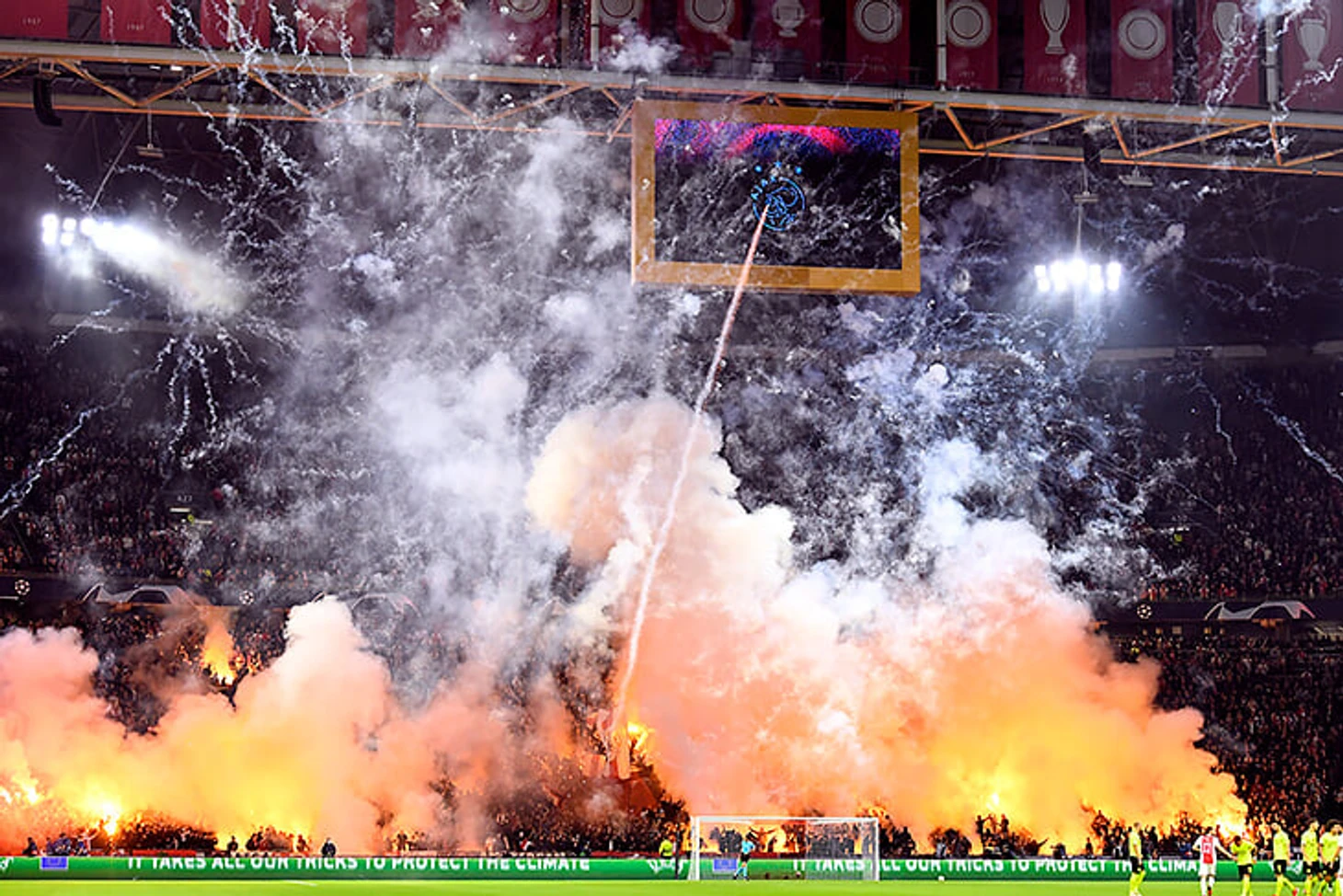 В Амстердаме фейерверк не только на поле, но и на трибунах. Пиробой фанатов «Аякса» и «Боруссии»