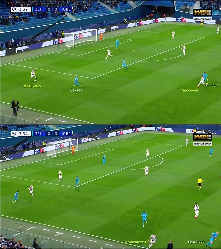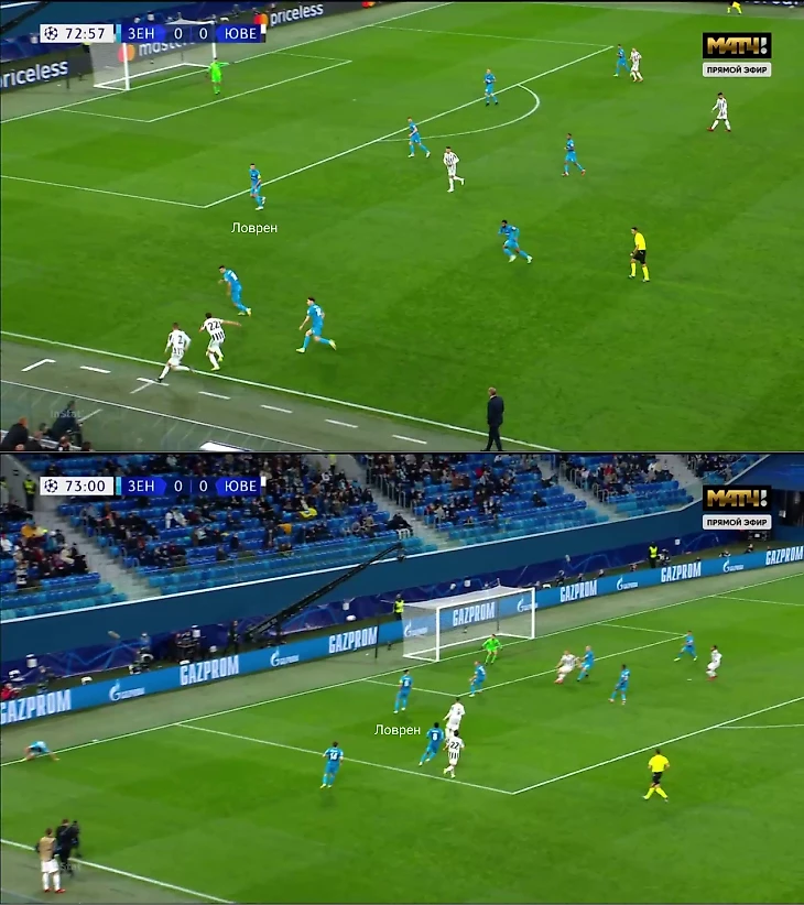 Подстройки «Зенита» и «Юве» увеличили количество потерь и переходов владения. Команда Аллегри тоже прессинговала. Главная идея – отсутствие свободы Ракицкого и Ловрена. Итальянцы позволяли пасовать на Чистякова, редко включались по Крицюку, но системное давление по разыгрывающим защитникам и центру поля – основное оружие.