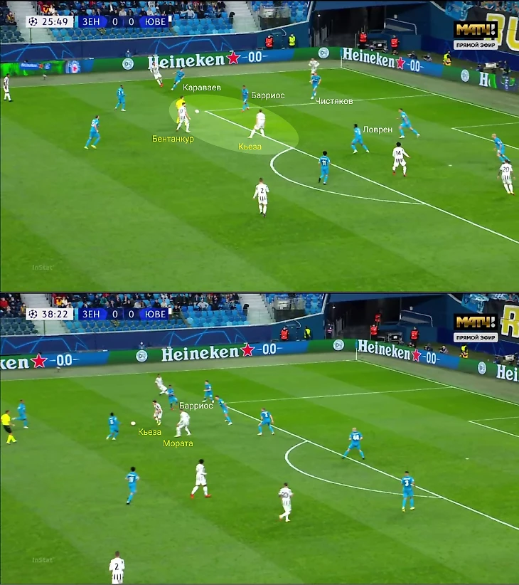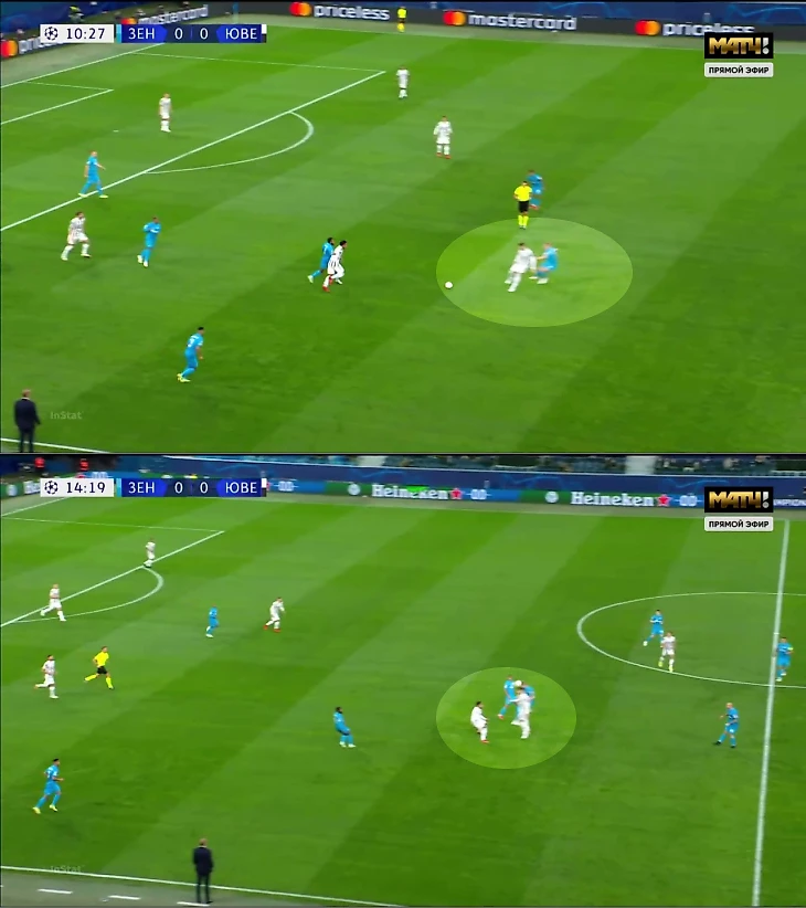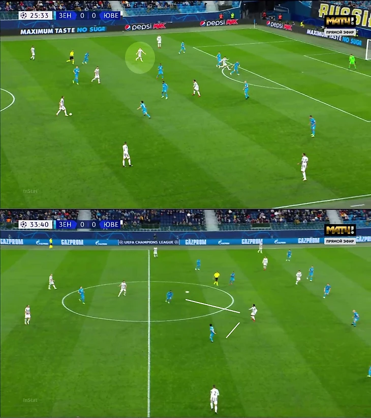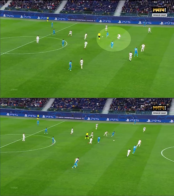 Основная причина – в том, что «Юве» растаскивал «Зенит» регулярными смещениями. Малком и Клаудиньо располагались узко – были близки к Венделу и Барриосу. Но время от времени они теряли игроков. Периодически «Зенит» получал свободного игрока в середине.