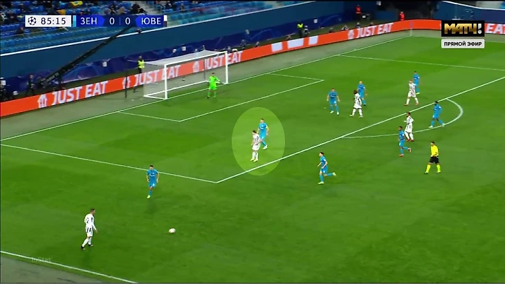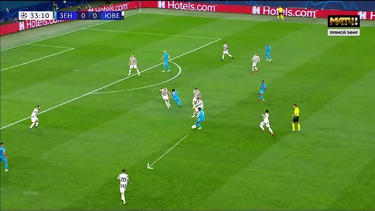 Движение Малкома и Клаудиньо становилось системным. «Зенит» акцентированно искал продолжение через середину. Несколько раз под передачи Ракицкого открывался Клаудиньо. Одна из атак закончилась простой ошибкой (бразилец не обработал передачу), другая – неудачной обводкой на подходе к штрафной. Еще одна – снова с помаркой, но защитник «Юве» тоже браканул, поэтому Клаудиньо пробил (снова помогло смещение Малкома).