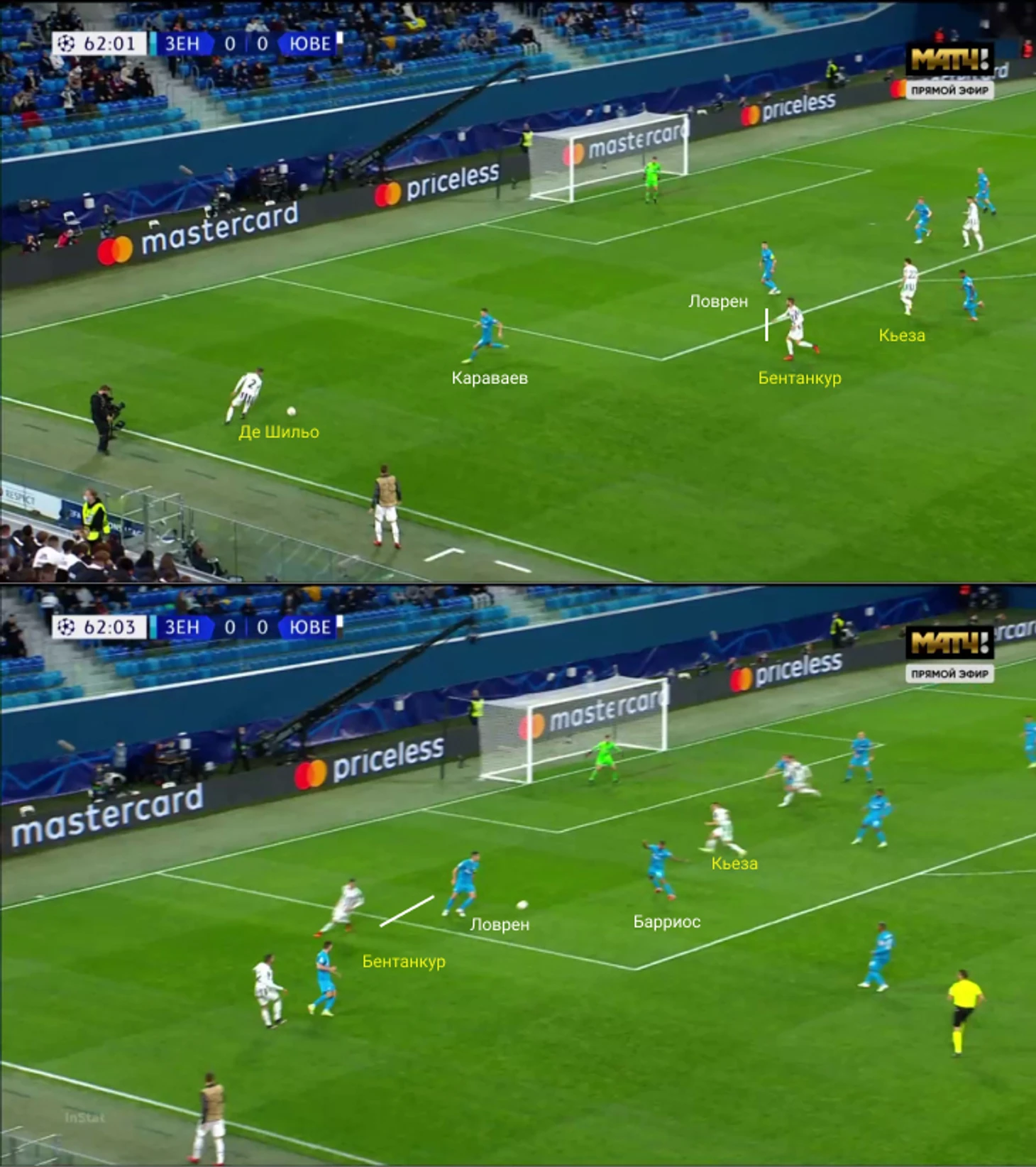 Первый пример – перевод Бонуччи налево. Вся пятерка – параллельно штрафной, поэтому Де Шильо практически у боковой. Караваев выбросился на оппонента, а Ловрен среагировал на перемещение Бентанкура. В итоге Деяна подстраховал Барриос – он следил за Кьезой.