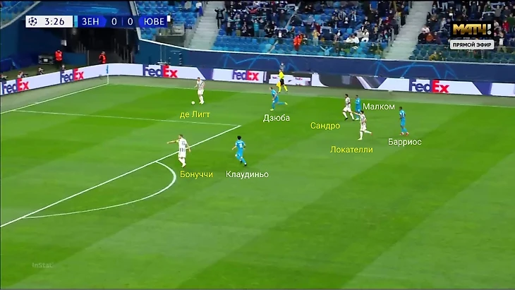 Сначала «Зенит» ставил на высокое давление и контрпрессинг. Команда Семака не боялась прессинговать около чужой штрафной. В основном «Зенит» стартовал с флангов. Принцип виден в этом эпизоде: Дзюба и Малком около Де Лигта и Сандро, Клаудиньо заужал пространство, перекрывая опорную зону и Бонуччи, плюс в Локателли вцепился Барриос.