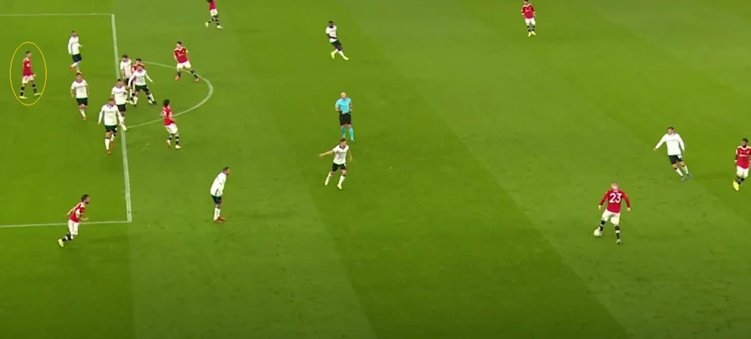 2. Люк Шоу получает мяч, а Криштиану по-прежнему в офсайде, создается ложное ощущение, что он выключен из игры: