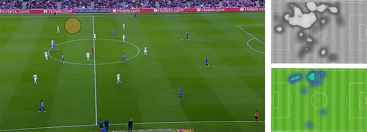Слева - позиция Гави во втором тайме. Справа - сравнение тепловых карт Гави в матчах против «Леванте» (вверху) и «Динамо» (внизу)