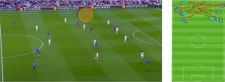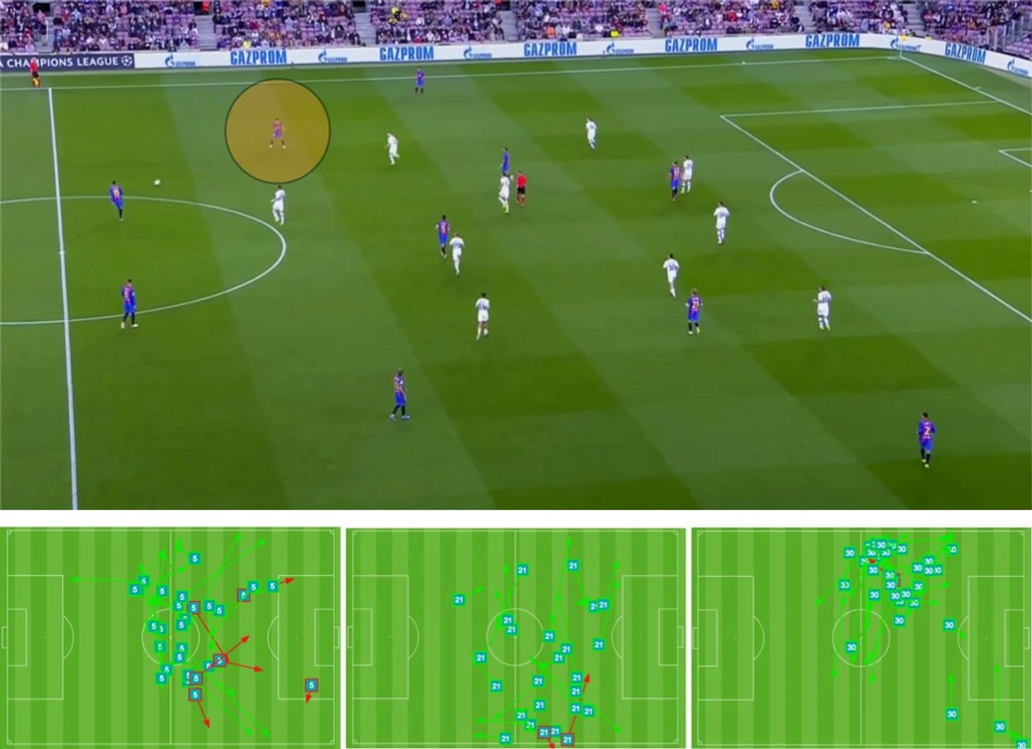 В матче против киевского «Динамо» повторное использование атакующих вингеров не помогло команде Кумана упростить походы к штрафной соперника, как это было в матче против «Валенсии» в Ла Лиге. Вновь с Дестом на правом фланге, но с Люком де Йонгом в роли нападающего и Мемфисом Депаем, сместившимся на левый фланг, чтобы чередоваться при проявлении там Жорди Альбы и Гави (на фото внизу слева). «Барса» столкнулась с совершенно другим соперником, когда дело дошло до интерпретации фаз игры без мяча. Если «Валенсия» Бордаласа стремилась прессинговать «Барсу» на половине поля соперника, подвергая себя риску уступить пространство за каждой из линий прессинга, то «Динамо» Луческу выбрало гораздо более пассивный, замкнутый подход, расположившись на своей половине поля, вдали от Тер Штегена, но без открытых областей на своей половине. В результате, не найдя явных свободных путей, позиционная атака «Блауграны» выглядела особенно вялой и практически не имела шансов продвинуться вглубь поля. Каждый мяч задерживался у игроков хозяев больше времени, чем хотелось бы, прежде чем находил партнера по команде, что лишало шансов поймать соперника на перемещении с фланга на фланг за счёт маневра, который бы создавал пространство в центральной зоне для полузащитников «Барсы». Роли Бускетса, Френки де Йонга и Гави были низведены до перемещения мяча перед украинскими полузащитниками, не имея возможности ни сделать острую передачу, ни оказаться в позиции между линиями соперника, и вынуждены были переправлять мяч на фланги (изображения выше).