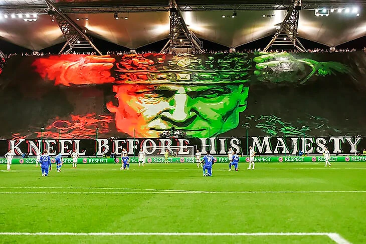 — Ну и последней, и самой громкой новостью, без преувеличения облетевший всю Европу, стал шикарный перфоманс фанатов «легии» на матче против «Лестера». Тогда кибицы польского клуба развернули оправу во всю трибуну с лозунгом «На колени перед Его Величеством!». Что в этот момент делали куколды из «Лестера»? Правильно, стояли на коленях в поддержку BLM.