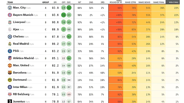 После того как были сыграны очередные матчи Лиги чемпионов Суперкомпьютер FiveThirtyEight оценил шансы команд на выход в стадию плей-офф, а также на финал и на победу.