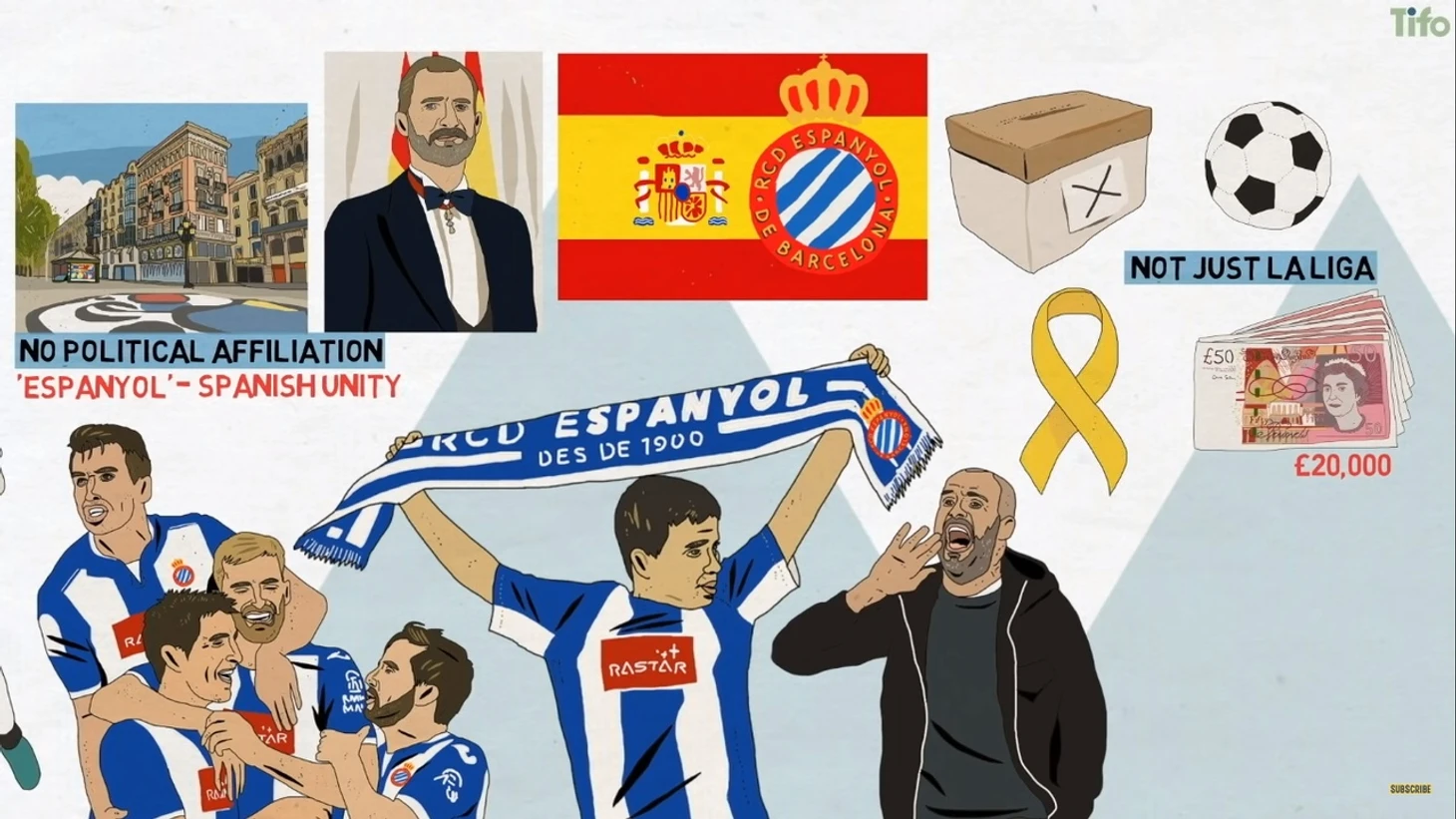 Позже, команда Зинедина Зидана столкнулась с "RCD Espanyol", также базирующимся в Барселоне. Многие полагали что это клуб без какой-либо конкретной политической принадлежности, но само название клуба несёт в себе коннотацию испанского единства. Его фанаты все чаще выражают лояльность короне, и с 2017 вокруг стадиона можно было увидеть все больше флагов и баннеров, посвящённых этому.