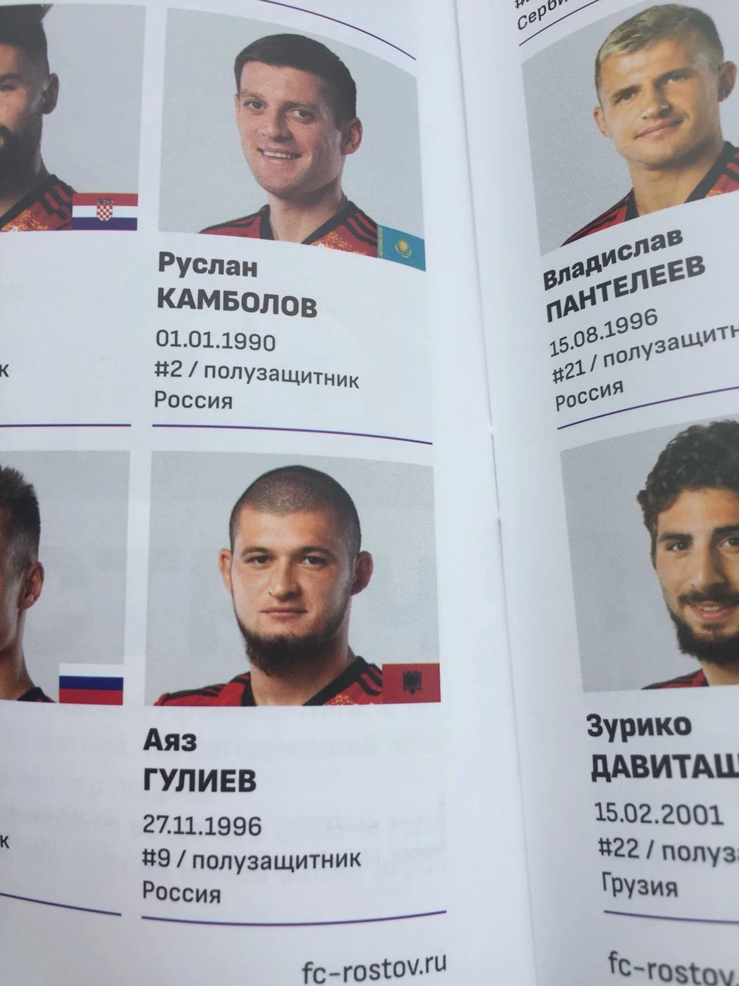 Посмотрите на фото с составом тульского «Арсенала» по мнению сотрудников «Ростова». Согласно программке, Руслан Камболов представляет Казахстан, а Аяз Гулиев – Албанию.