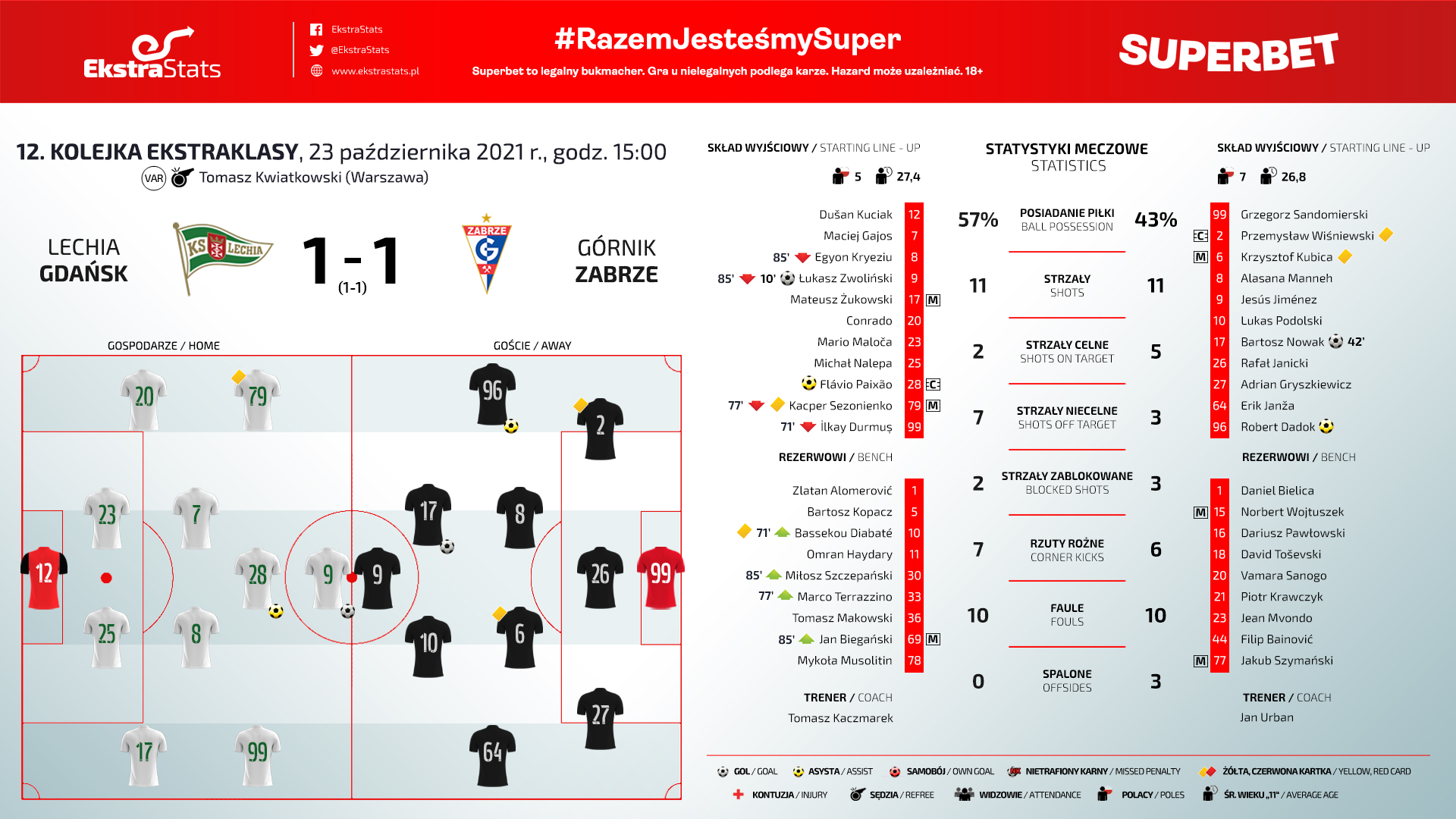 «Лехия» провела свой худший матч при Качмареке, после быстрого мяча гданьчане практически ничего не создали у ворот Сандомерского, забжане же сумели не только ответить на голевой удар Зволиньского, но и были ближе к победе. Интересно, что Ян Урбан за весь матч не произвёл ни одной замены в составе гостей.