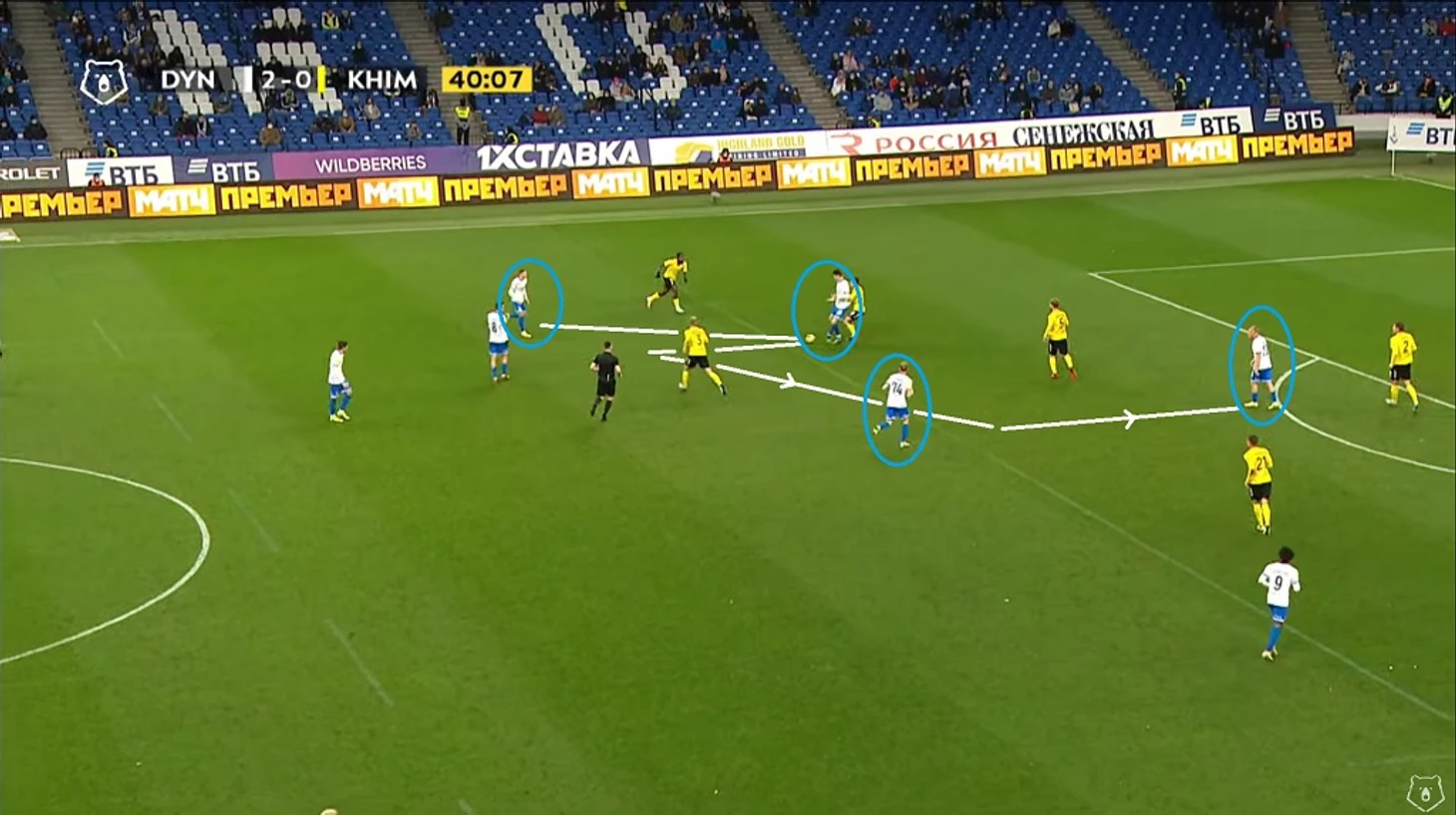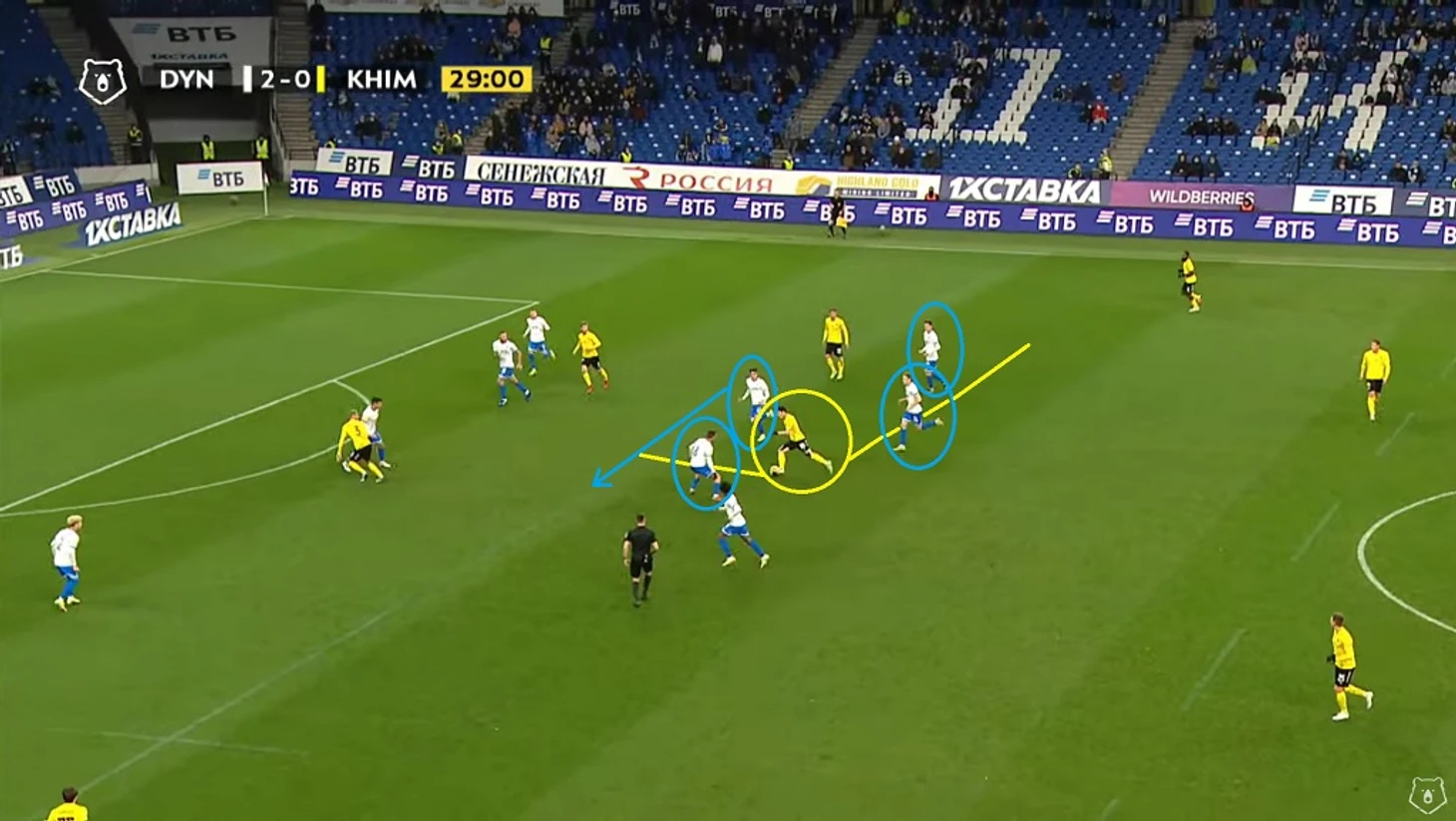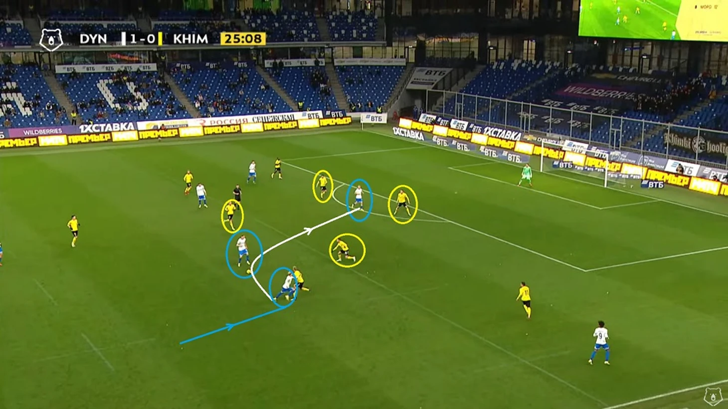 23 минута — типичный для современного Динамо (последние полтора года) розыгрыш мяча в одно касание. В первые полгода работы Шварца функциональный футбол преобладал над комбинационным, но теперь, когда физически команда стала играть лучше, возвращается и комбинирование, выходя на новый уровень — всё чаще и больше появляется подобных розыгрышей мяча. В центре внимания снова Нжи.