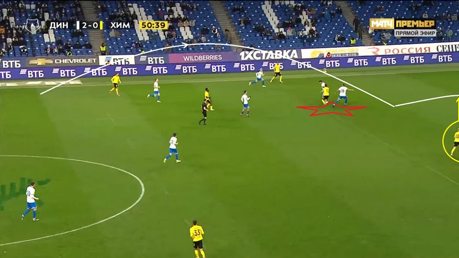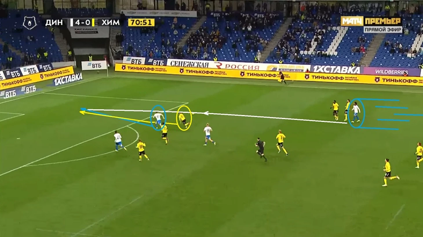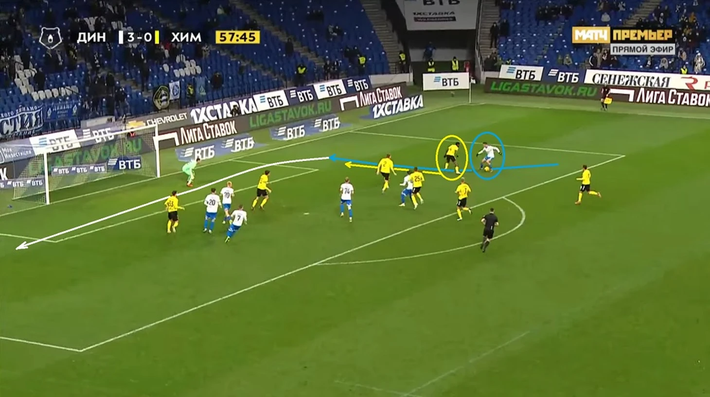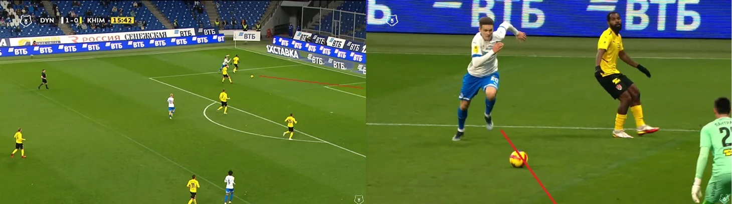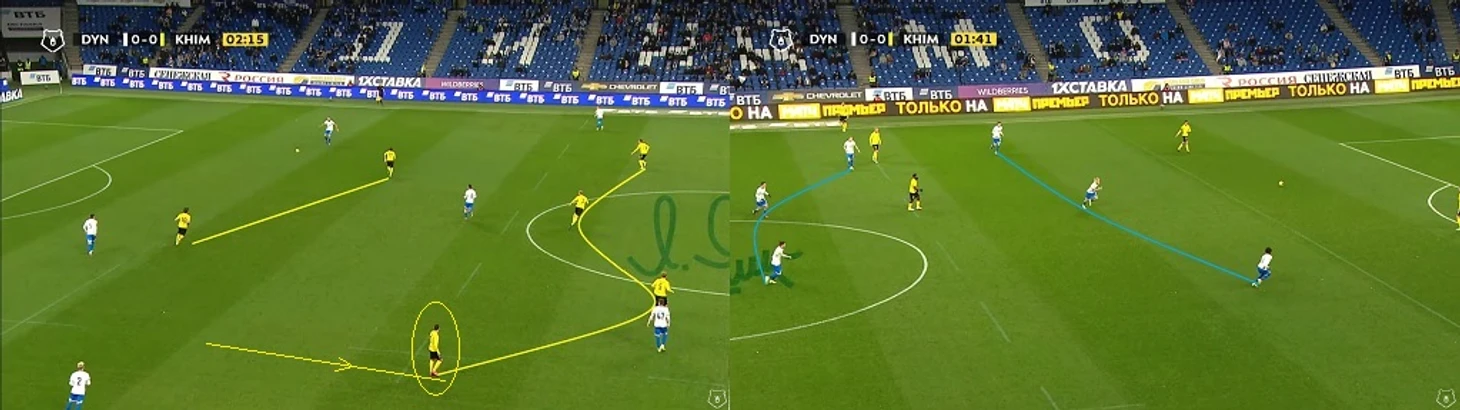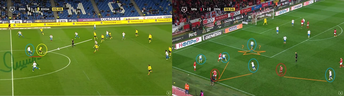 Подбор остался за Динамо и мы стали организовывать позиционную атаку. Однако, Химки перехватили мяч и попытались убежать в свою контратаку. И вот тут-то и можно рассмотреть показательную игру нашей обороны — Мирзов ещё не получил мяч, а к нему уже выдвинулся Бальбуэна. Такая плотная игра с соперником лишает того времени не только на обработку мяча, но и на принятие решений. Пусть у нашего парагвайца не получилось отобрать мяч, но ведь именно такой плотности и не хватило нам туром ранее против Спартака. Ещё раз два момента для сравнения.