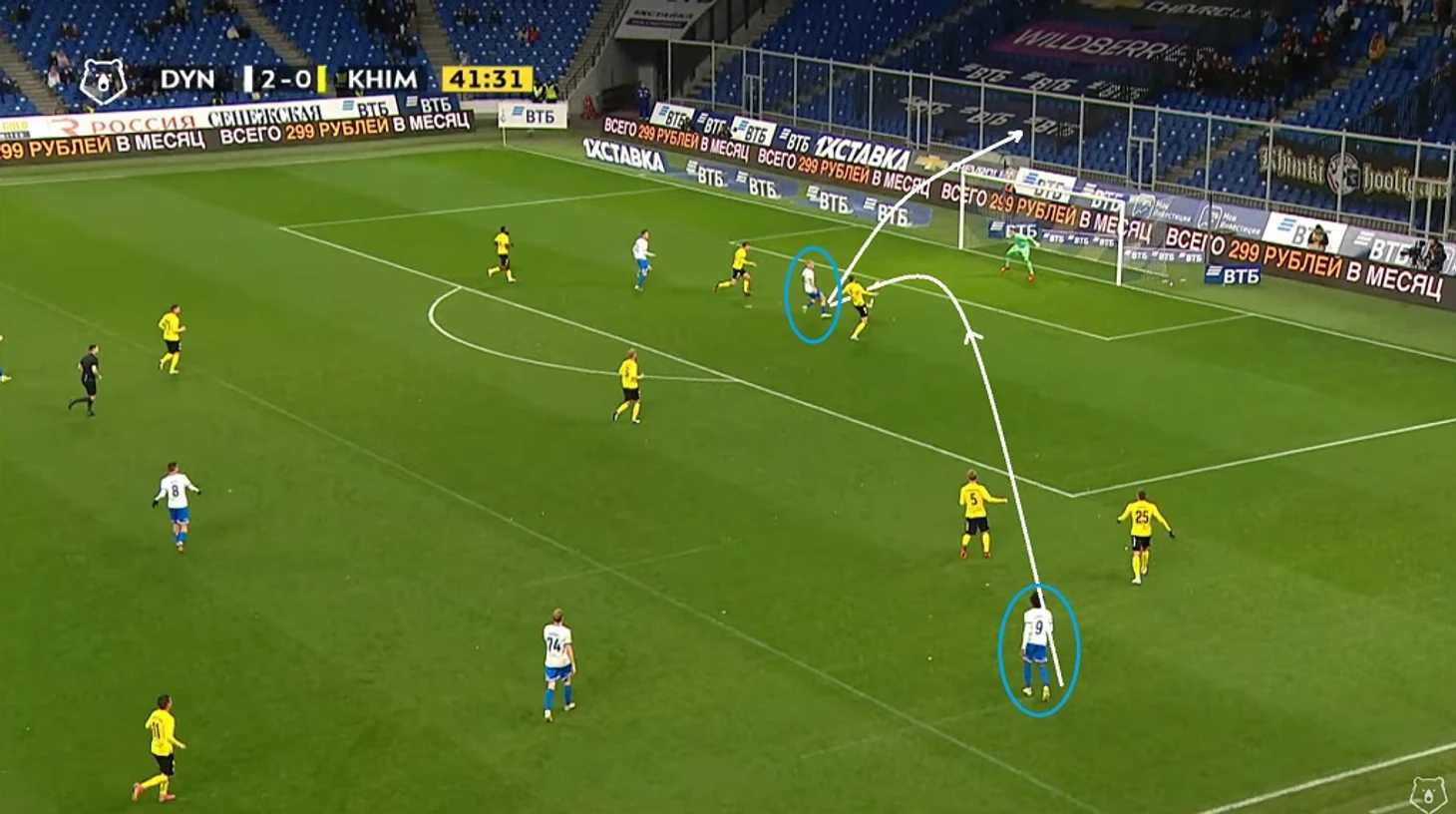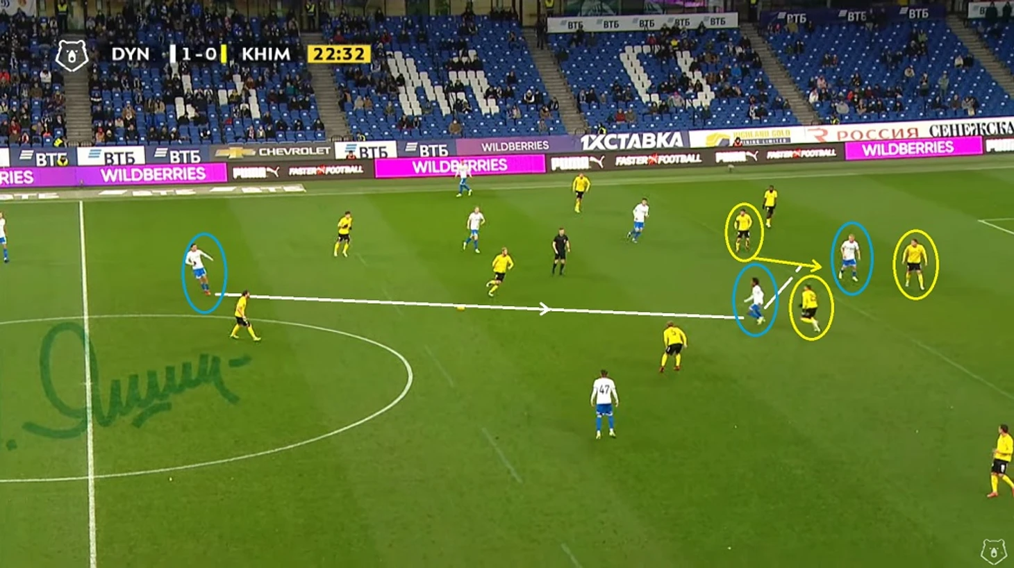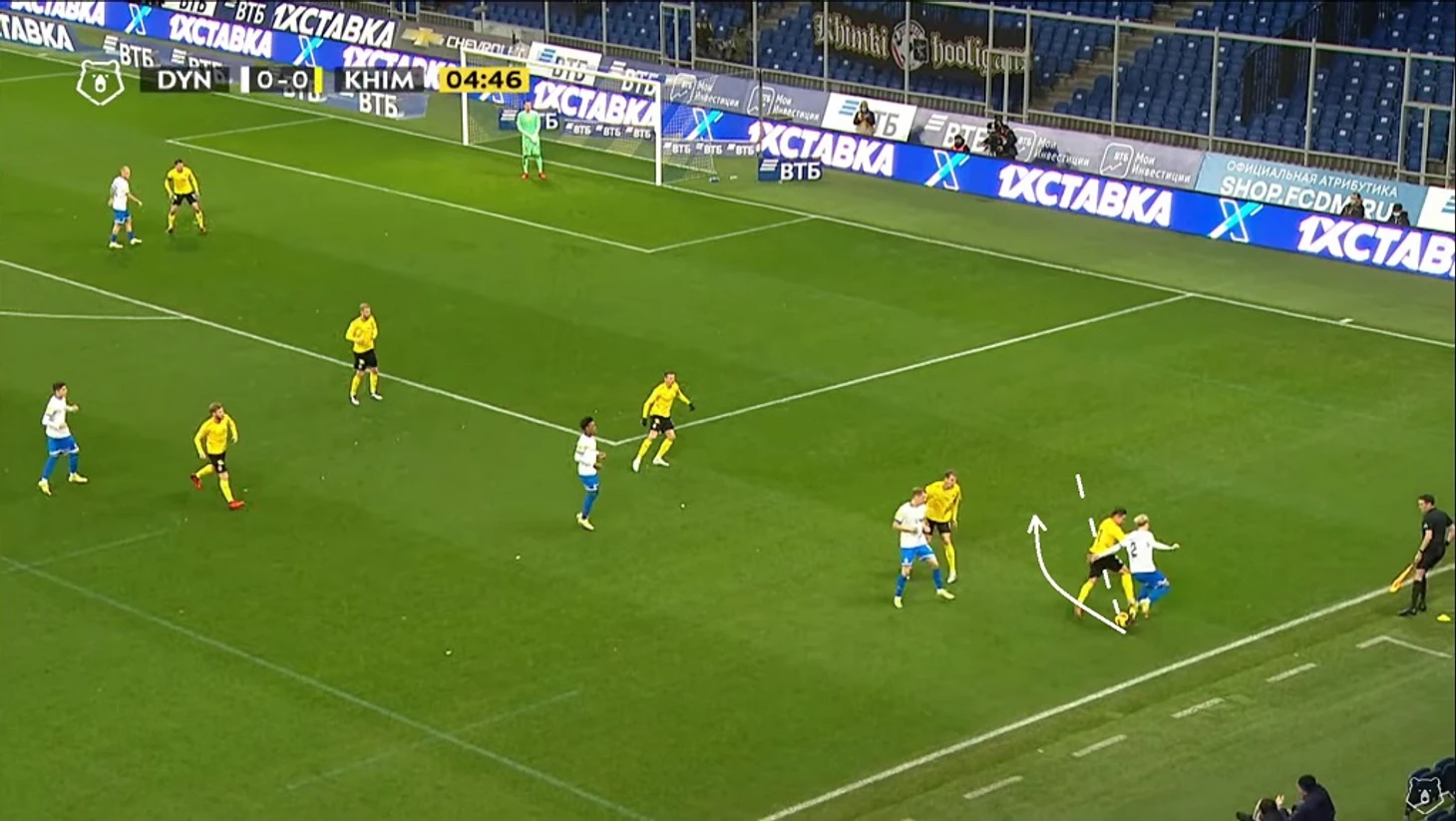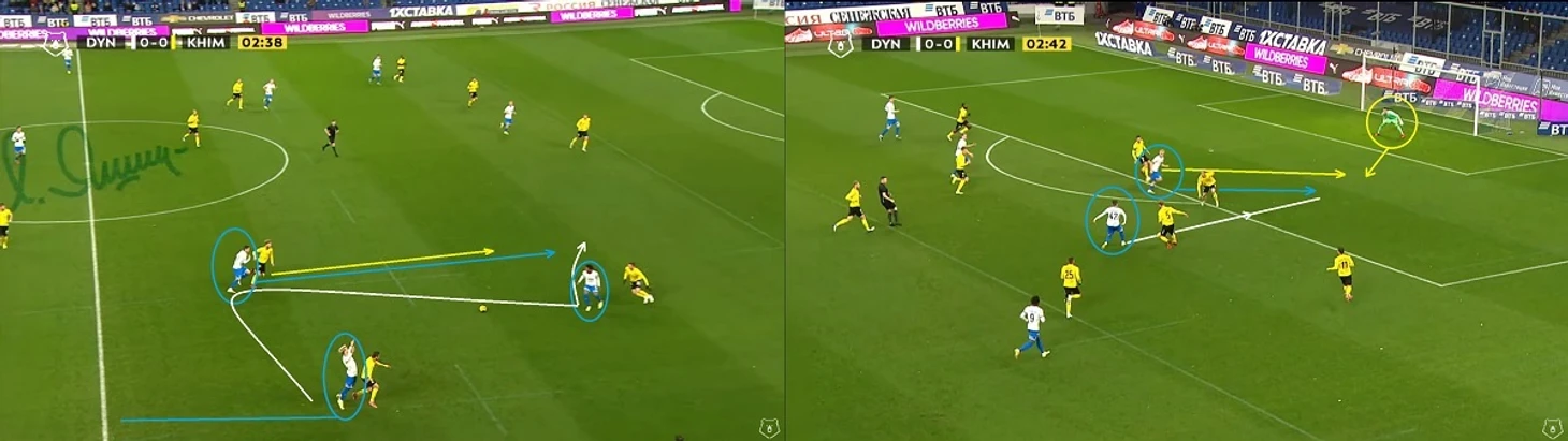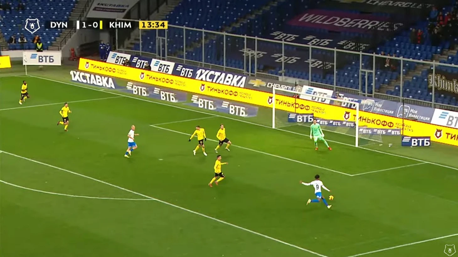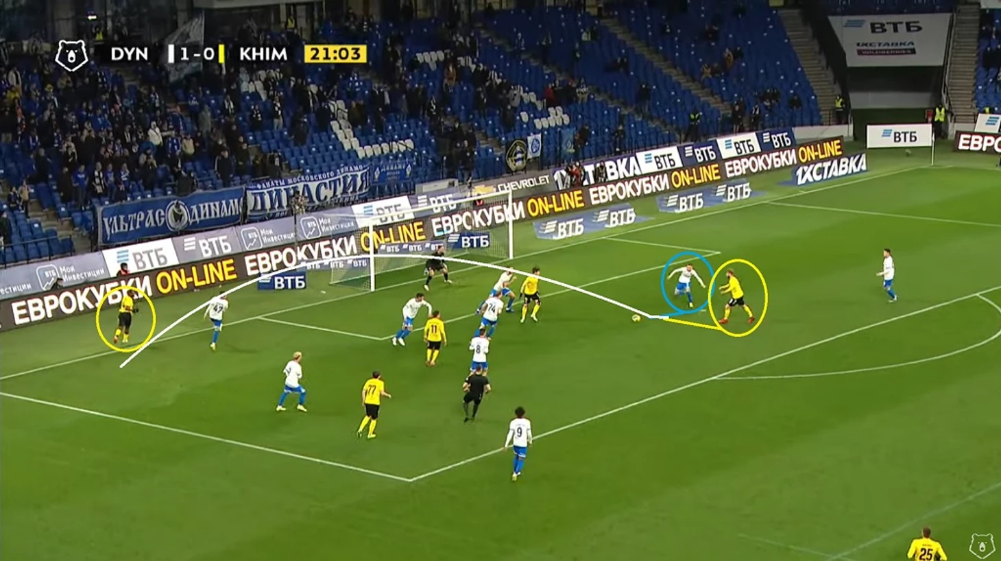 Подбор остался за Динамо и мы стали организовывать позиционную атаку. Однако, Химки перехватили мяч и попытались убежать в свою контратаку. И вот тут-то и можно рассмотреть показательную игру нашей обороны — Мирзов ещё не получил мяч, а к нему уже выдвинулся Бальбуэна. Такая плотная игра с соперником лишает того времени не только на обработку мяча, но и на принятие решений. Пусть у нашего парагвайца не получилось отобрать мяч, но ведь именно такой плотности и не хватило нам туром ранее против Спартака. Ещё раз два момента для сравнения.