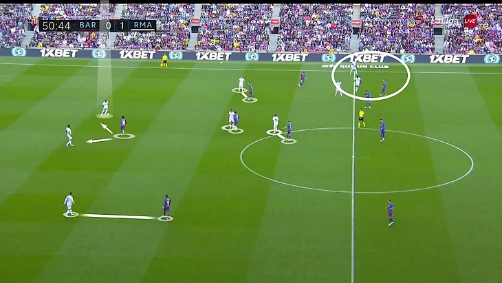 Это отчасти объясняет, почему даже в удачный стартовый отрезок («Мадрид» еще не адаптировался, а «Барса» была свежей) не получилось создать много угроз. Был только один удар – шикарный шанс Сержиньо Деста после быстрой атаки. А вот с трансформацией территориального преимущества в моменты были огромные проблемы. Эпизод с пропущенным тоже начался с попытки расположиться под навес. Он хорошо объясняет, почему такой подход был не только неэффективным, но и вредным.