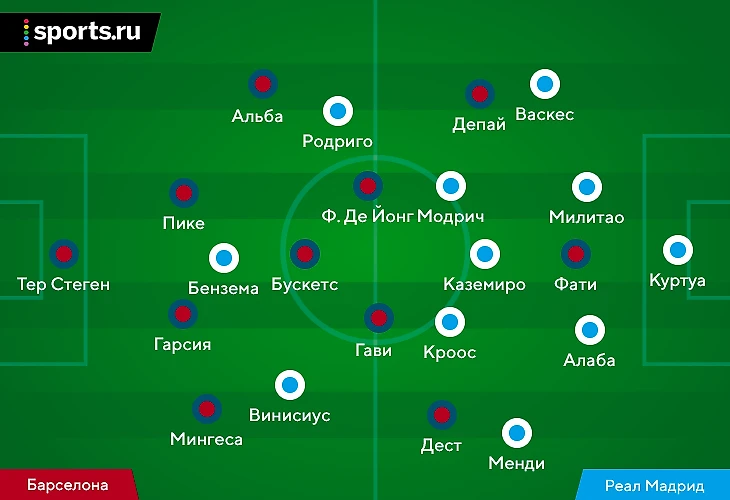 У «Мадрида» ключевая дилемма касалась правого фланга обороны. Дани Карвахаль вернулся, но пока не готов стартовать. Без него тут поиграли и Начо, и Лукас Васкес, и даже Феде Вальверде (классные универсалы, но позиция для них не родная). Решение было особенно важным, потому что у хозяев в этой зоне оперирует Жорди Альба (возможно, самый опасный игрок «Барсы» прямо сейчас). Карло Анчелотти доверился Васкесу.