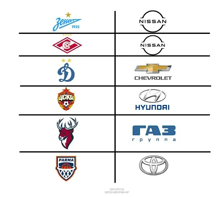 Если мы посмотрим на российские клубы, то из 52 профессиональных клубов-участников РПЛ, КХЛ и ЕЛ ВТБ, только 6 российских клубов имеют автомобильные бренды-партнеры. Из них, четыре из РПЛ («Зенит», ЦСКА, «Динамо», «Спартак»), клуб из КХЛ («Торпедо», Нижний Новгород) и один клуб из Единой Лиги ВТБ («Парма-Париматч», Пермь).