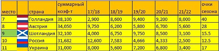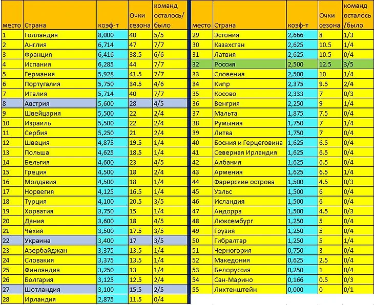 Мы уже почти-почти догнали Эстонию(точнее она нас обошла), Казахстан, Финляндию, Словакию и Азербайджан. Ассоциации, имеющие по одной команде...Молдавию в лице Шерифа, Хорватию в лице Динамо Загреб и Норвегию в лице Будё-Глимт, мы, скорее всего, не догоним даже тремя командами. Возможно, обойдём Ирландию, представленную нулём команд. Шанс малы, но есть. Достаточно двух побед(для нас это сравни подвигу!!).