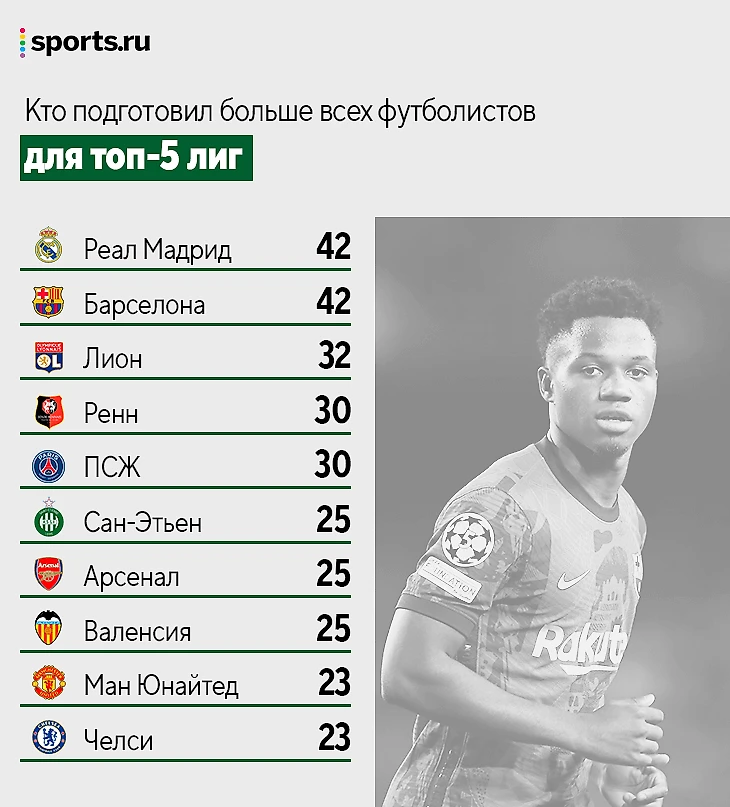 • Расклады отличаются, если говорить о подготовке кадров только для топ-5 лиг. Больше всего игроков для элитных чемпионатов подготовили «Барселона» и мадридский «Реал» – по 42 футболиста. Но у «Реала» выше тренировочный индекс – это значит, что его воспитанники играют в более статусных клубах с большим количеством игрового времени. Зато у «Барсы» чуть ниже средний возраст (26,3 против 27,1).