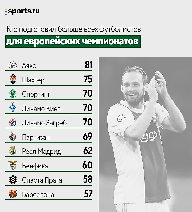 • «Аякс» подготовил больше всего игроков для европейских национальных чемпионатов – 81. Следом идет «Шахтер» (75), третье место (70) делят «Спортинг» и два «Динамо» – киевское и загребское.