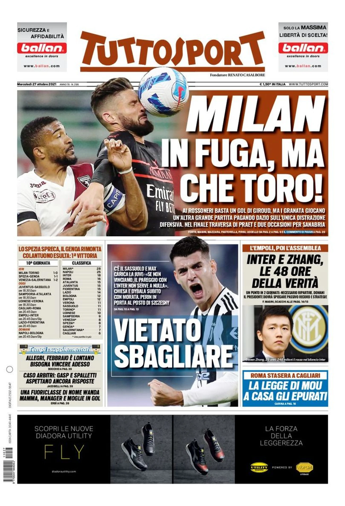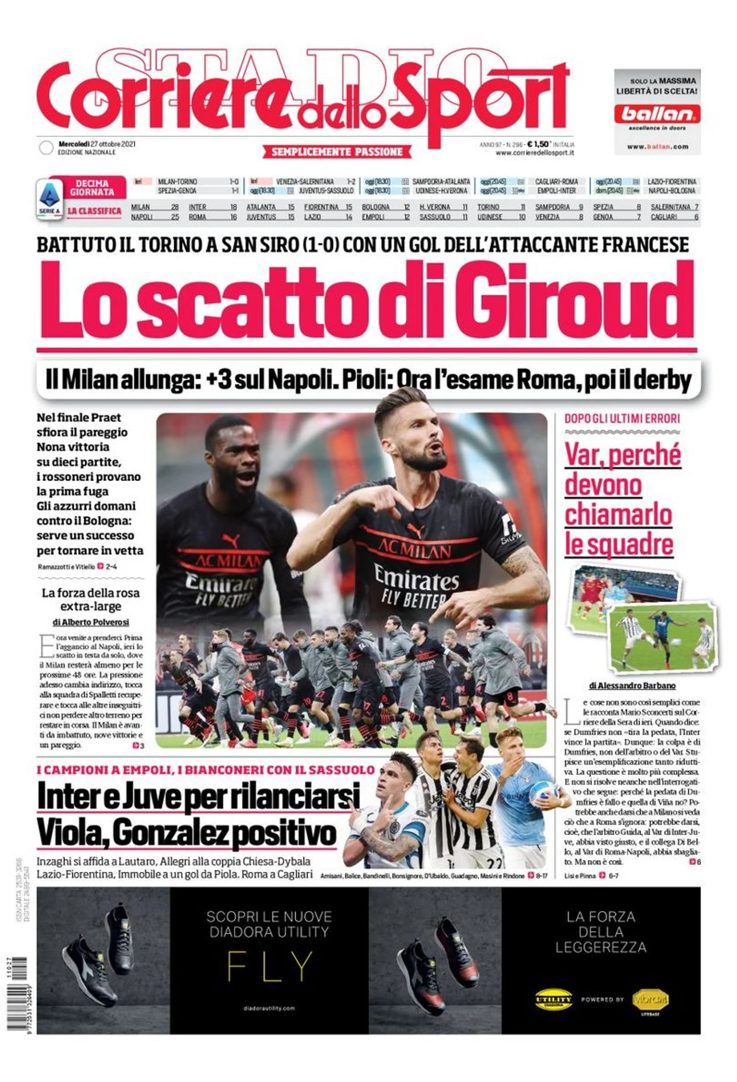 Победили «Торино» на «Сан Сиро» (1:0) благодаря голу французского нападающего. «Милан» отдаляется: +3 очка преимущества над «Наполи». Пиоли: «Теперь экзамен «Ромой», затем дерби». В концовке Прат упустил ничью. Девятая победа в десяти матчах, Россонери впервые пытаются оторваться. Адзурри завтра против «Болоньи»: необходим успех, чтобы вернуться на вершину.
