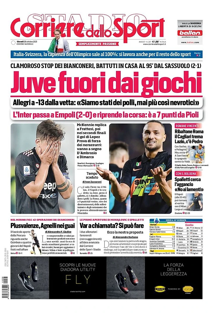 Победа «Интера» над «Эмполи», поражение «Ювентуса» от «Сассуоло», успех обеих римских команд, а также сегодняшний матч «Наполи» с «Болоньей» – в утреннем обзоре заголовков итальянских спортивных изданий в блоге «В гостях у Кальчо».