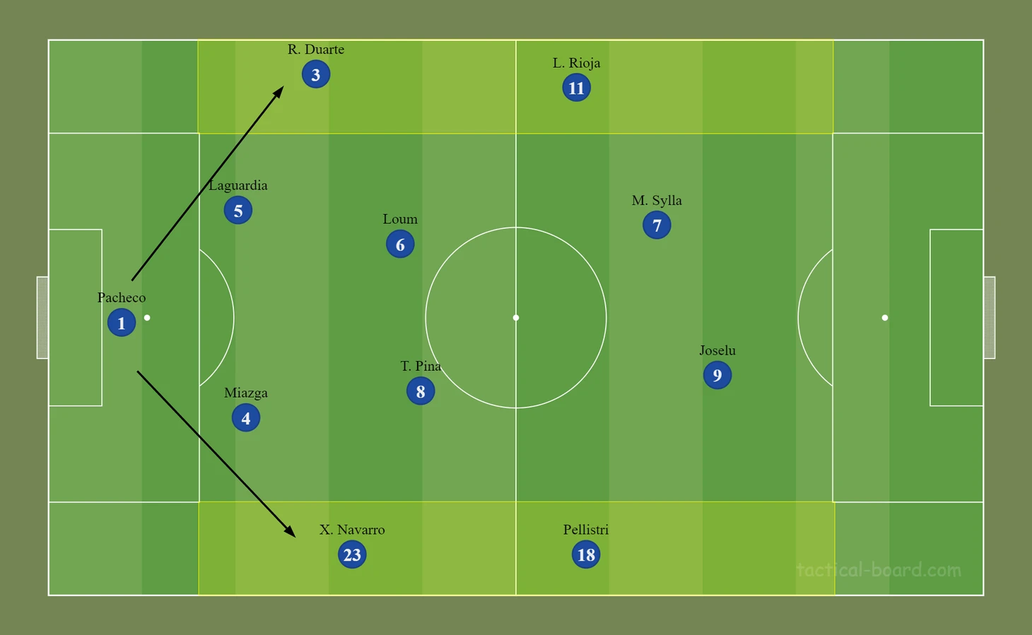 При билд-апе команда сразу доставляет мяч на фланг. На то есть две причины: во-первых, клуб из Витории-Гастейс таким образом развивает атаки, пытаясь как можно быстрее доставить мяч до атакующих футболистов, во-вторых, это осторожность, ведь в таком случае при потере проще совершить отбор на краю поля (соперника ограничивает бровка), а также снижается риск встречной вертикальной атаки оппонента.