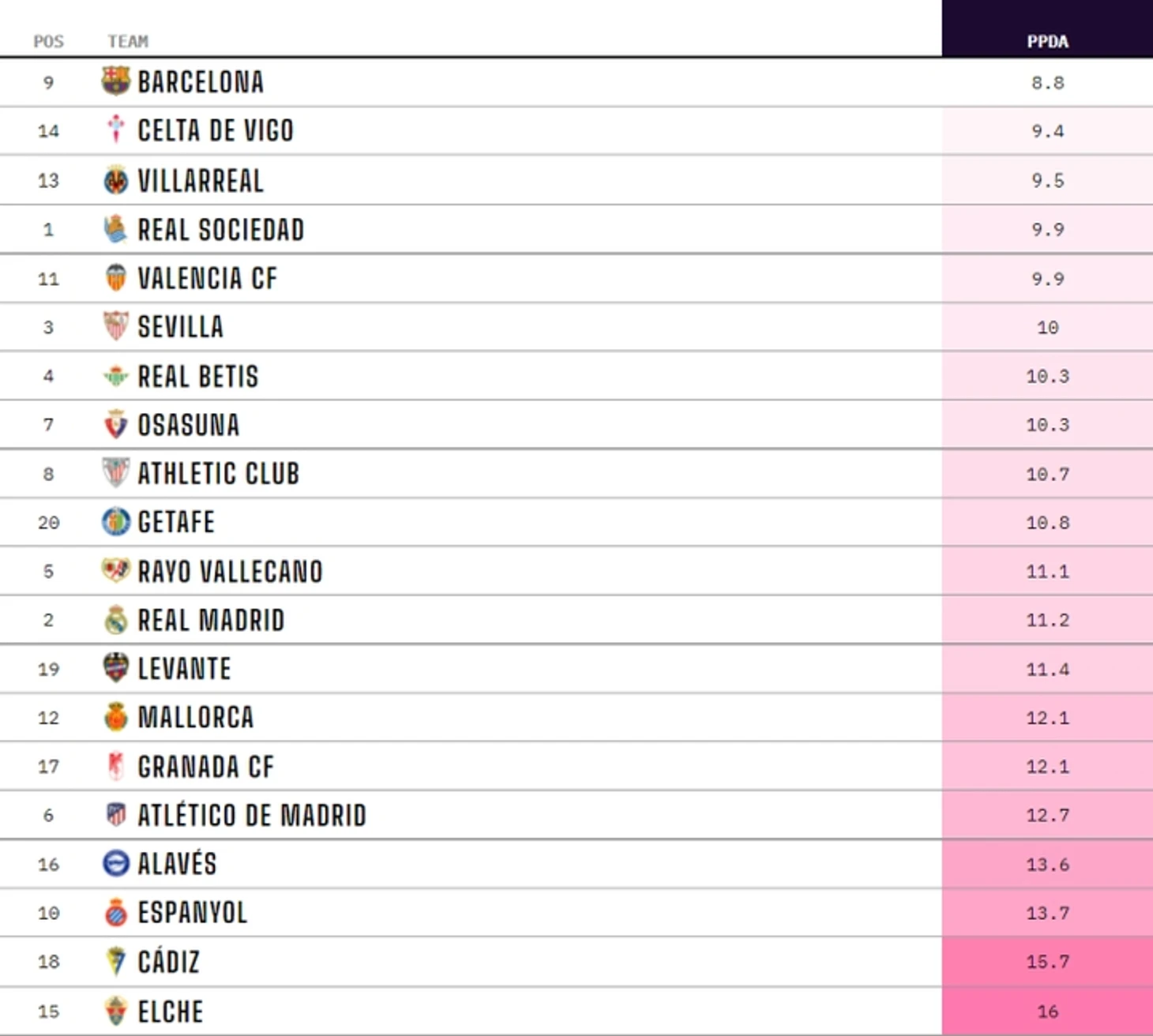 «Алавес» спокойно отдаёт сопернику мяч, действуя при этом в низком и среднем блоках. Команда не стремится заполучить контроль над игрой, концентрируясь на сохранении надёжности в центре и перекрывании зон, что выливается в отсутствие высокого прессинга на регулярной основе (такой прессинг можно увидеть лишь изредка). После потери подопечные Кальехи чаще всего сразу откатываются в оборону и занимают свои позиции, начиная давление в середине или на своей половине поля, при среднем значении PPDA (показатель частоты и эффективности прессинга) в этом сезоне — 13.6. По этой метрике «Алавес» занимает четвертое с конца место среди клубов Примеры. Любопытно, что на первом месте расположилась «Барселона» с показателем 8.8. Лидирующий в турнирной таблице «Реал Сосьедад» с показателем 9.9 занимает 4 место.