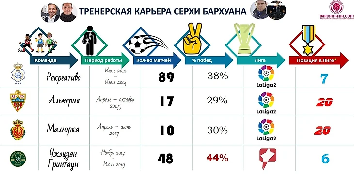 Поэтому к Серхи есть вопросы и по филиалу, и по тому, что он может дать первой команде. Однако, Бархуан — человек бывалый, отнюдь не со стороны пришедший. И от него вполне можно ожидать, что на короткой дистанции в роли И.О. он не будет ничего особо изобретать и мудрить, а просто поддержит команду на плаву, опираясь на классические ценности «Ла Масии», с которыми он хорошо и близко знаком. Бархуан и сам является кантерано, который добился очень многого в первой команде, играя с такими легендами как Куман, Гвардиола, Луис Энрике, Сакристан, Стоичков, Ромарио, Лаудруп, Бегиристайн, Бакеро, Ривалдо и так далее по списку. К тому же, Серхи успел три года отыграть под предводительством самого Йохана Кройффа. Да и как коуч «Рекреативо», Бархуан 4 раза встречался с «Барселоной Б» и неизменно побеждал — общий счёт противостояния аж 9–2.