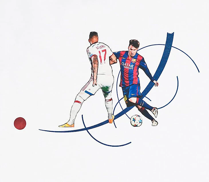 Месси, посадивший на пятую точку Джерома Боатенга в полуфинале ЛЧ-2014/2015 против «Баварии». Серия полукругов Кандинского подчеркивает талант нападающего непредсказуемо менять траекторию движения, а коричневый шар слева фиксирует выбранное направление финального рывка.