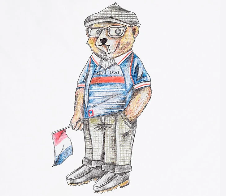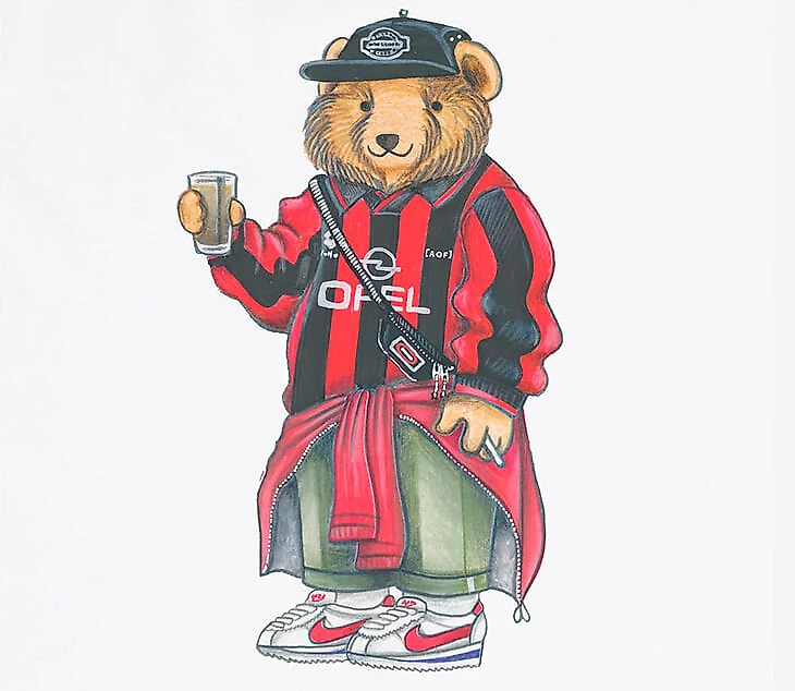 Мэтт создал рисунок, ставший фишкой Art of Football: медведь Пиклз олицетворяет фанатов и все, что связано с фанатской культурой. Вот этот под номером семь (отсылка к Дэвиду Бекхэму) стал первым.