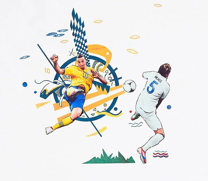 Удар с лета Ибрагимовича, завершившийся голом в ворота сборной Франции на Евро-2012 и признанный лучшим на том турнире. Желтые фигуры Кандинского насыщают эпизод энергией, а длинные линии сужающейся трапеции дают почувствовать силу удара.