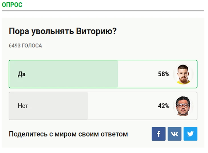Примечательно, что на этот опрос я наткнулся под новостью, в которой Витория говорит "Команде необходимы свежие люди. <...> Я вижу игру, если есть варианты А, Б и В, я стараюсь их применять". Тренер видит варианты, старается их применять, но они не дают результат. Может в таком случае попробовать поискать более реалистичные варианты? А впрочем, Рассказов не играл еще центрального нападающего, такой вариант тоже можно попробовать...