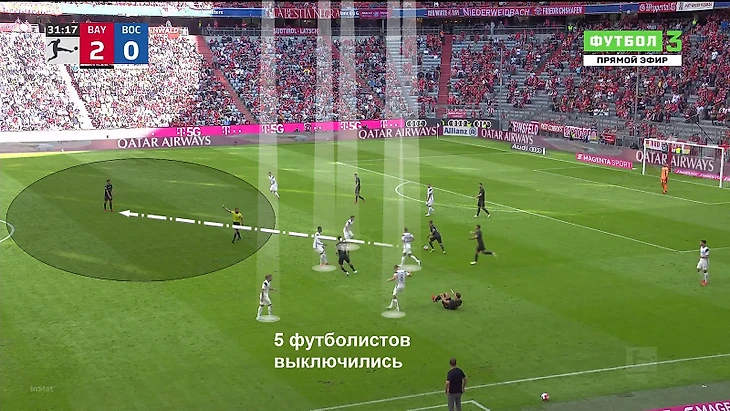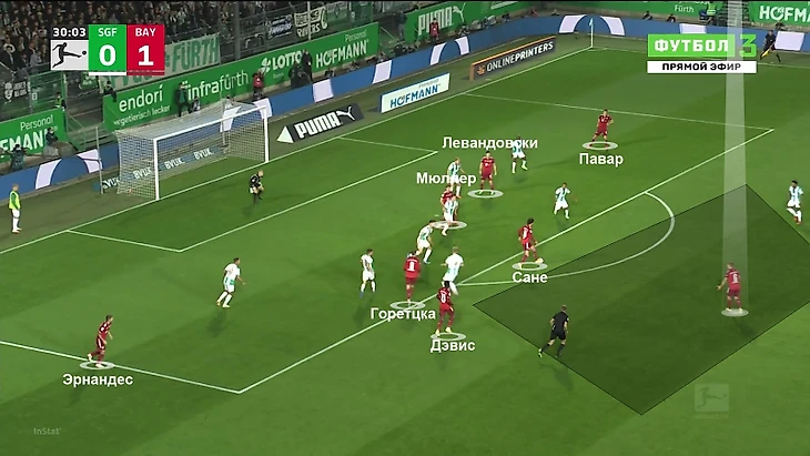Вот как «Бавария» забила второй гол: на ударных позициях в центре находятся Сане, Левандовски и Мюллер, на дальнюю штангу готов забегать Павар, из глубины поднялся Эрнандес, Горетцка тоже на линии штрафной. Дэвис пасом находит отклеившегося Сане, а тот катит под удар Киммиху. В штрафной – восемь футболистов «Фюрта», но никто не блокирует потенциальный удар Йозуа. Идеальное исполнение против автобуса.