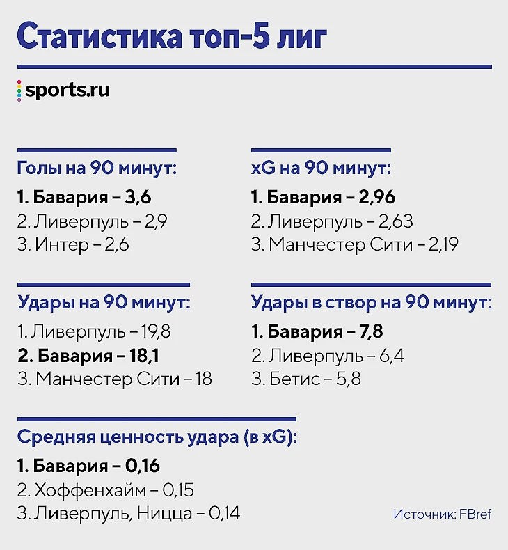 По качеству футбола «Бавария» с большим запасом оторвалась от соперников в Германии, а в топ-5 лигах с ней конкурирует только «Ливерпуль». Не думайте, что это просто личная оценка, вот ключевая статистика.