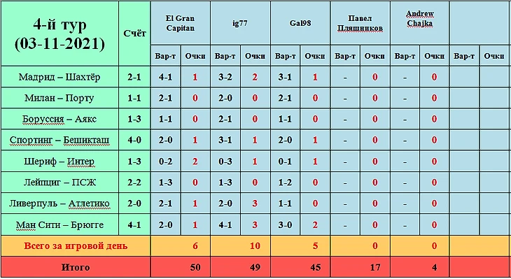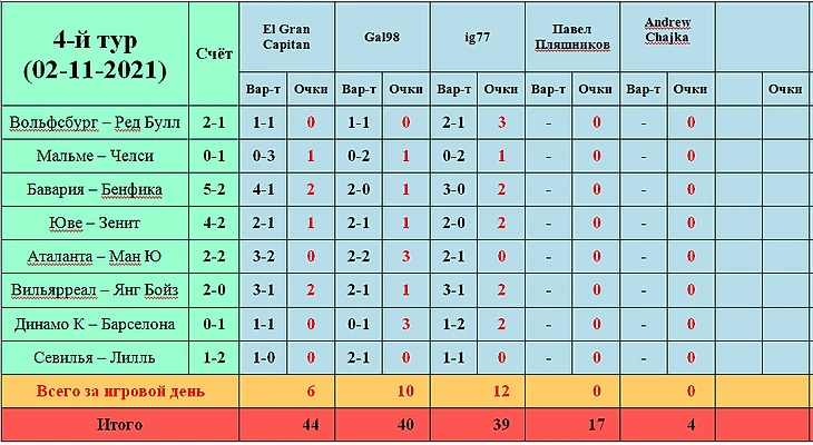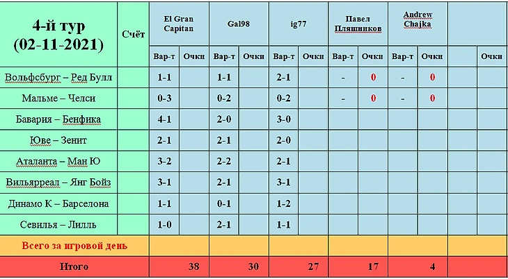 И для начала мы приветствуем нового участника! Прямо скажем, Павел ворвался в нашу таблицу, как метеор и сходу обыграл всех ветеранов в рамках прошедшего тура... Причём, он единственный, кто смог угадать точный счёт за 16 сыгранных матчей! Т.е., из наших 48 прогнозов всего тура - ни один точного счёта не дал. Вот так вот...