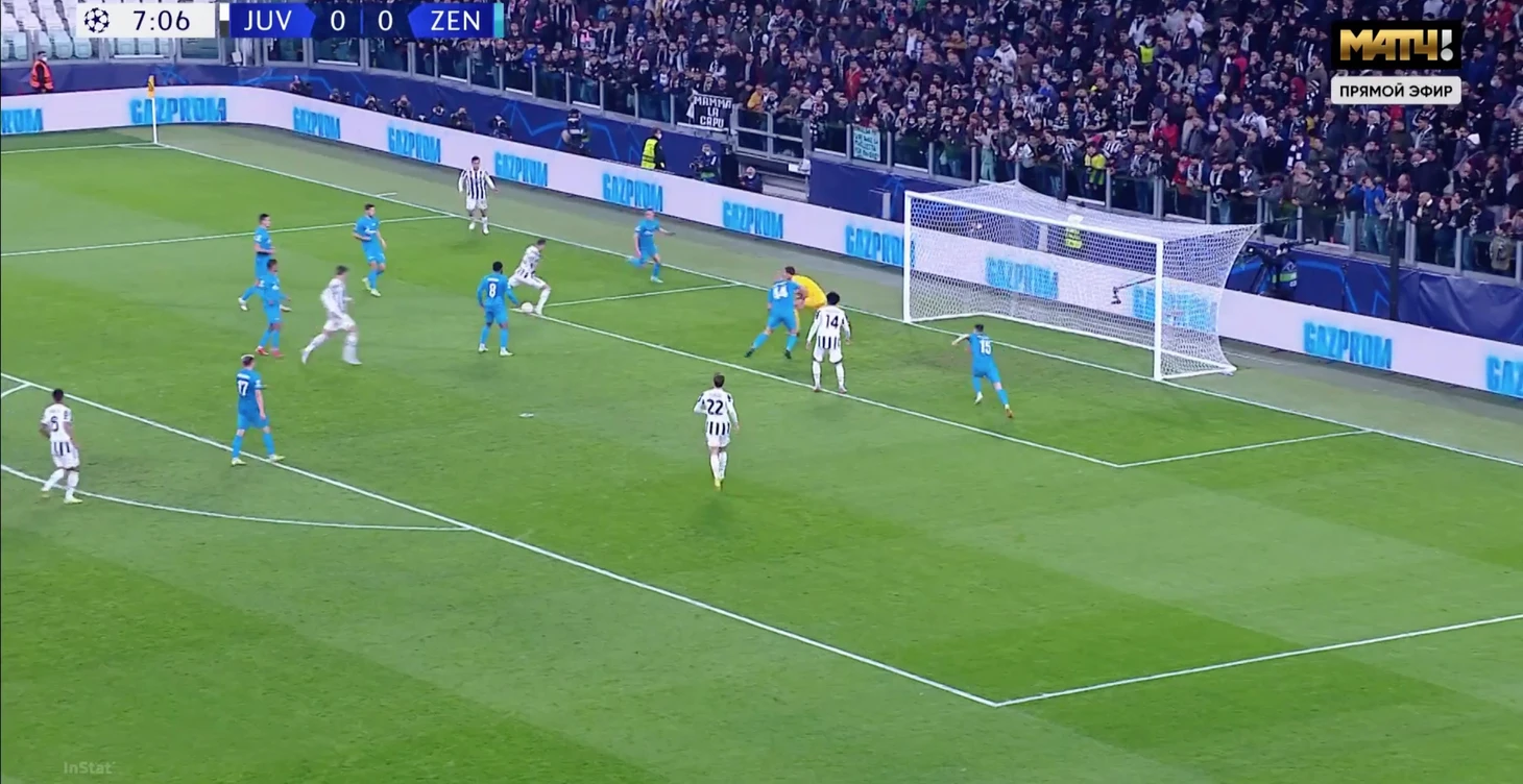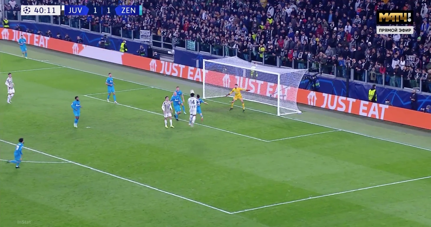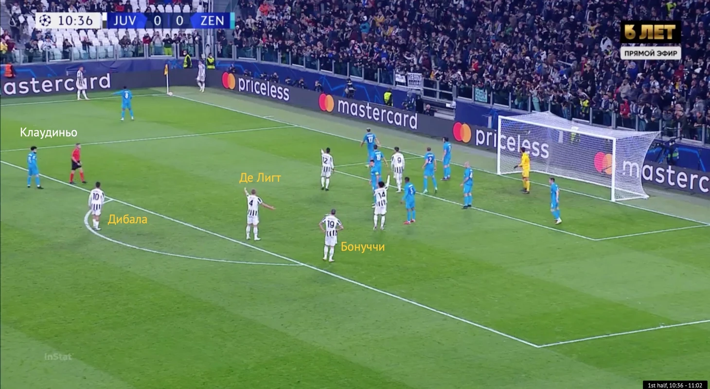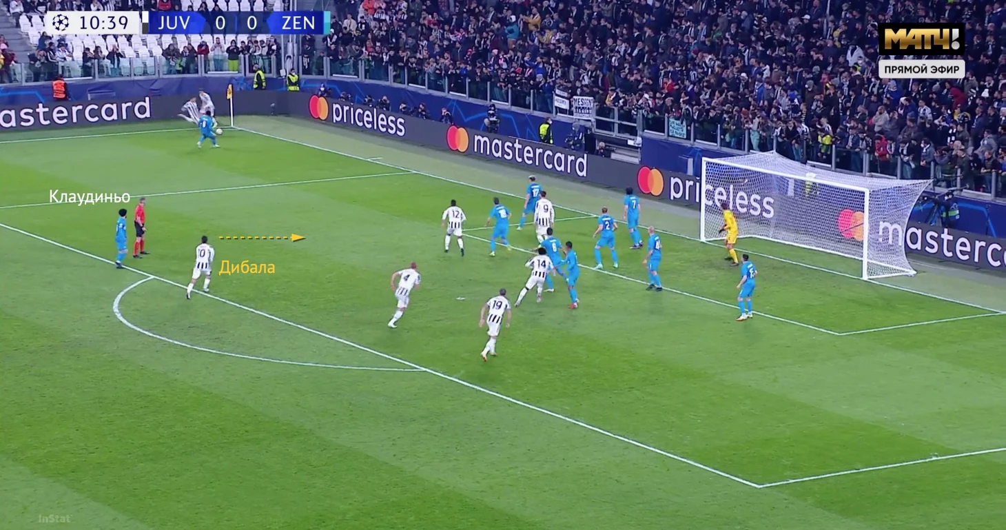 Во время голевого углового «Ювентуса» «Зенит» защищался зонно – ничего нового. Де Лигт и Бонуччи стартовали от линии штрафной, немного за ней располагался Дибала. Ближайшим игроком «Зенита» к Дибале оказался Клаудиньо, который даже оценил положение соперников.