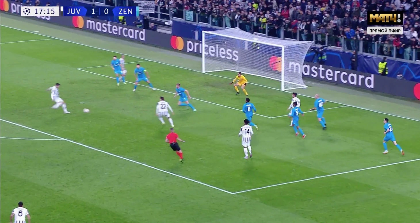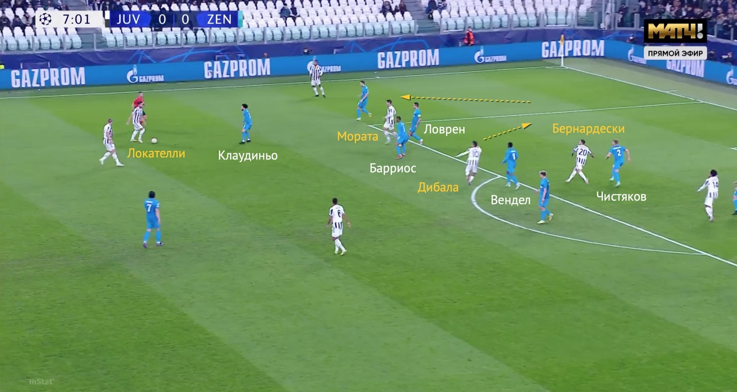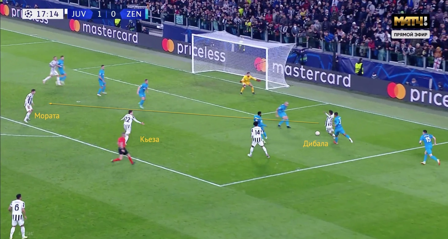 Дибала легко проскочил двух зенитовцев, а на линии штрафной в это время остались свободными Кьеза и Мората.
