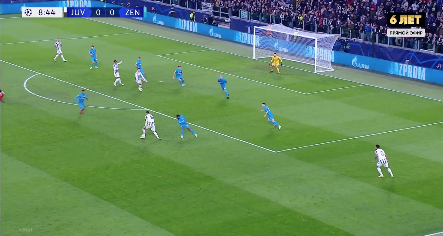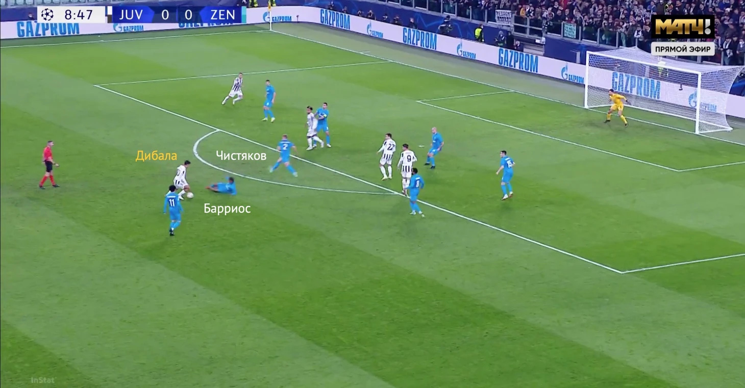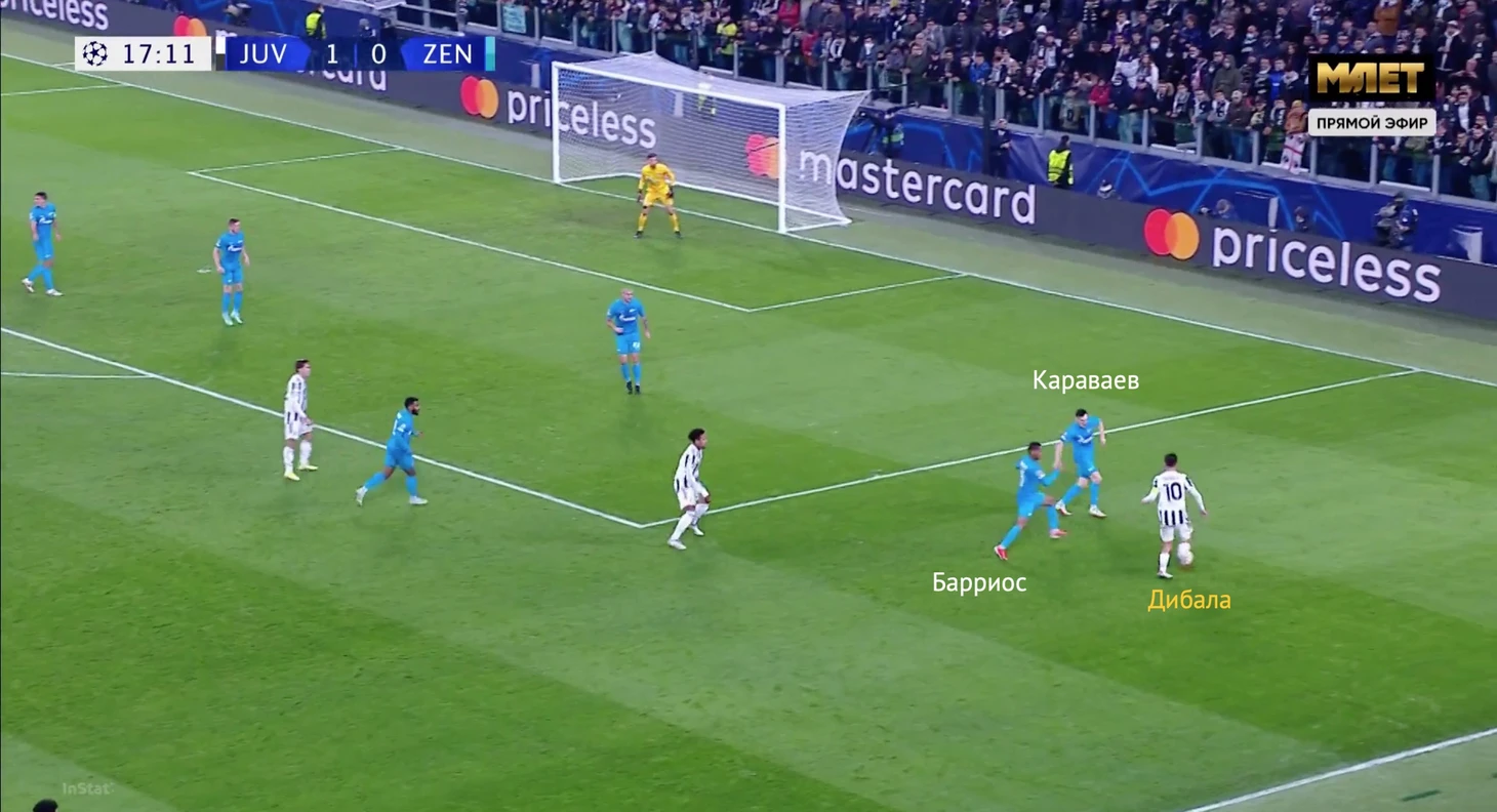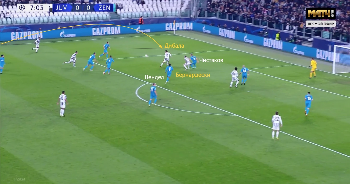 Сразу после начала движения Дибалы Вендел бросил нападающего «Юве» – тот свободно принял мяч в штрафной «Зенита».