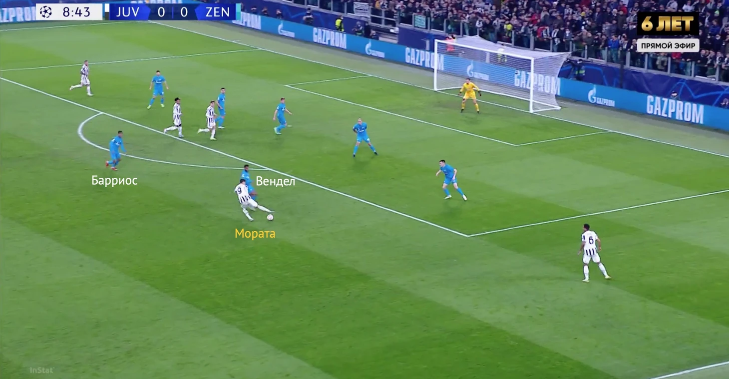 Хорошая оборона «Зенита» началась уже на 8-й минуте. Во время позиционной атаки «Юве» Мората ушел из штрафной и увел за собой Ловрена. В свободную зону нырнул Дибала, по которому играл Вендел.