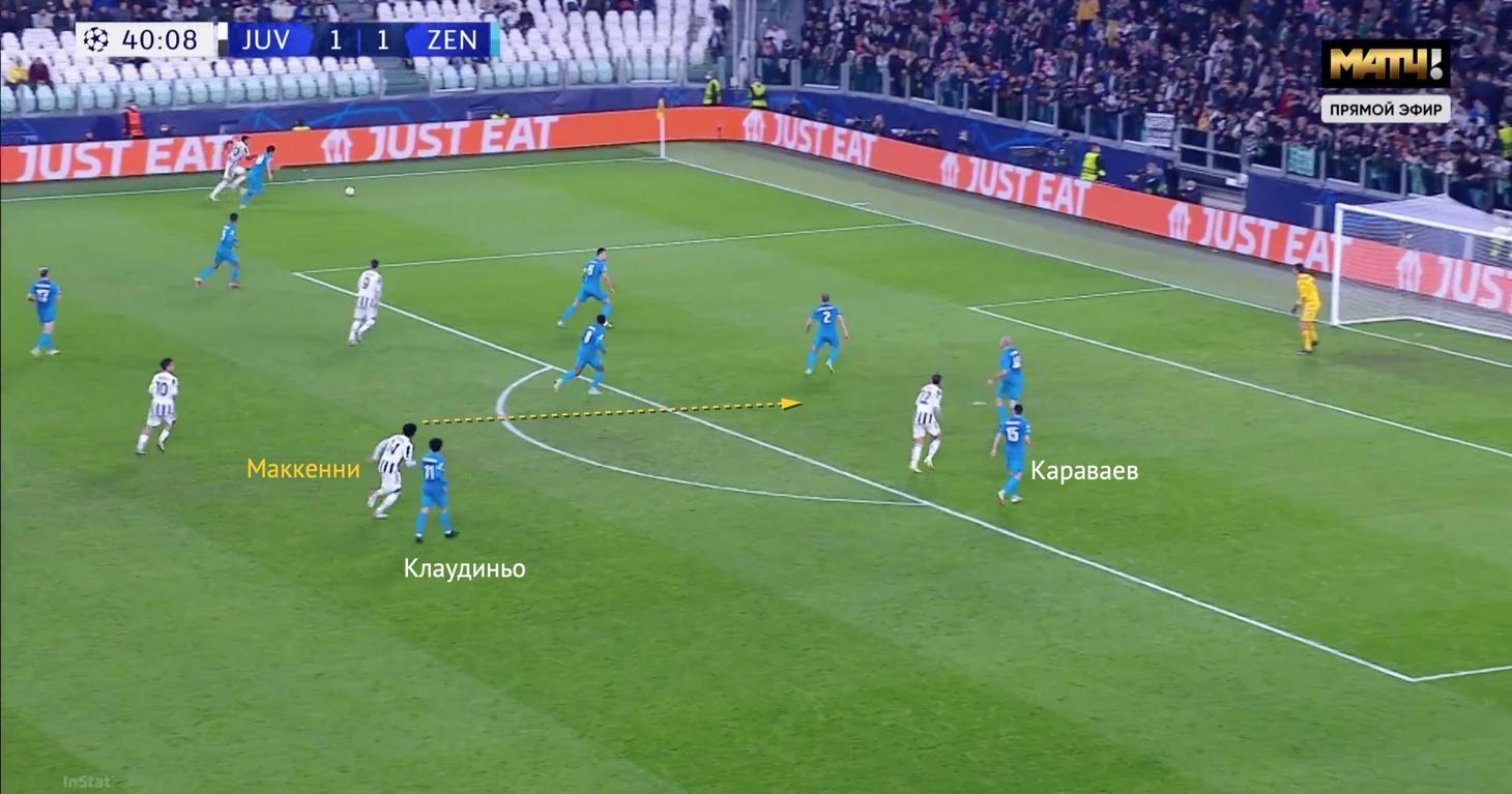 Ближе к концу первого тайма снова недисциплинированно сыграл Клаудиньо. «Ювентус» атаковал через левый край, Алекс Сандро проткнул мяч мимо Сутормина и готовился к навесу. Маккенни начал движение в штрафную – ближе всех к нему был Клаудиньо.