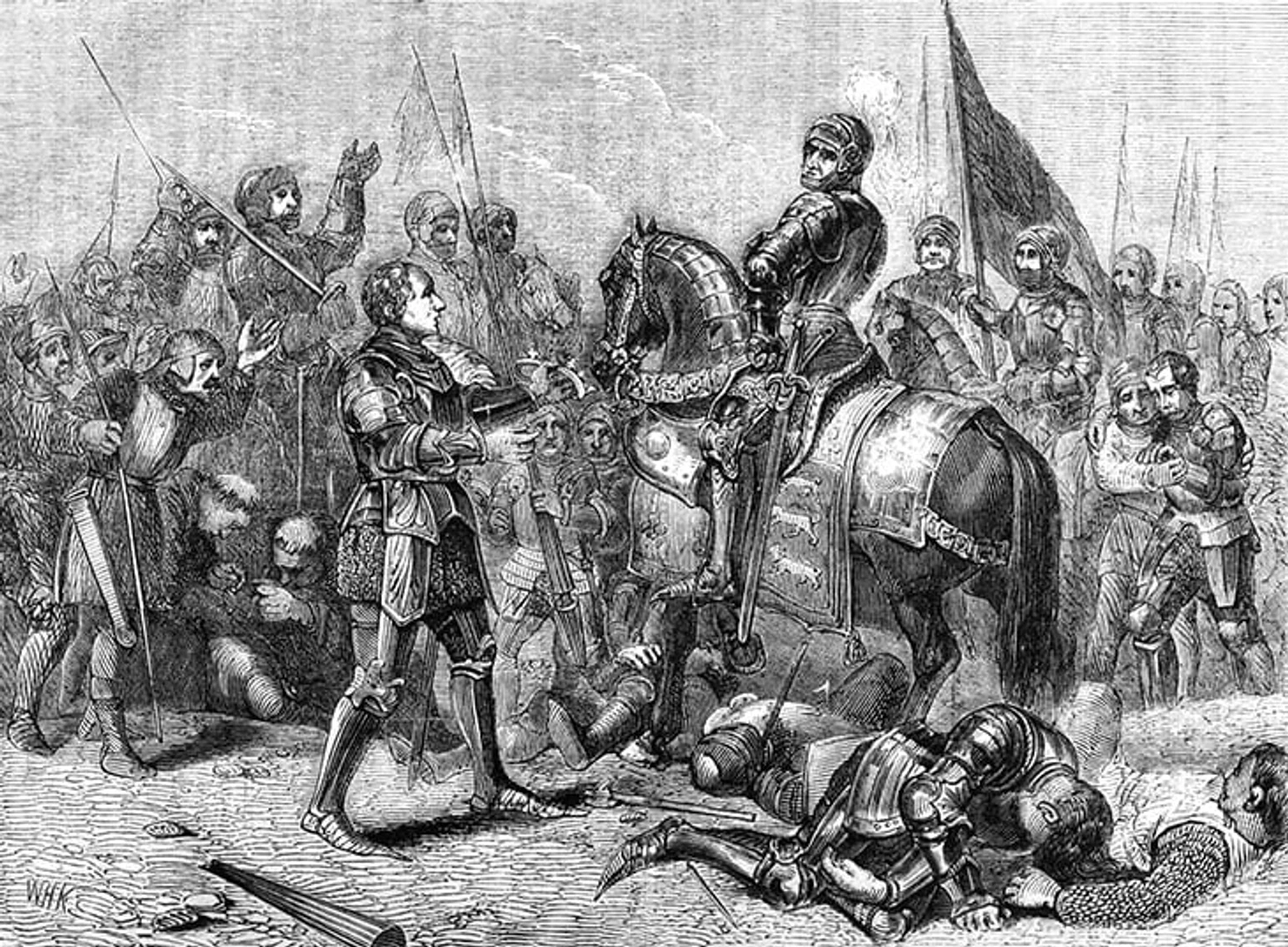 Генриху Тюдору (на коне) приносят корону павшего Ричарда III