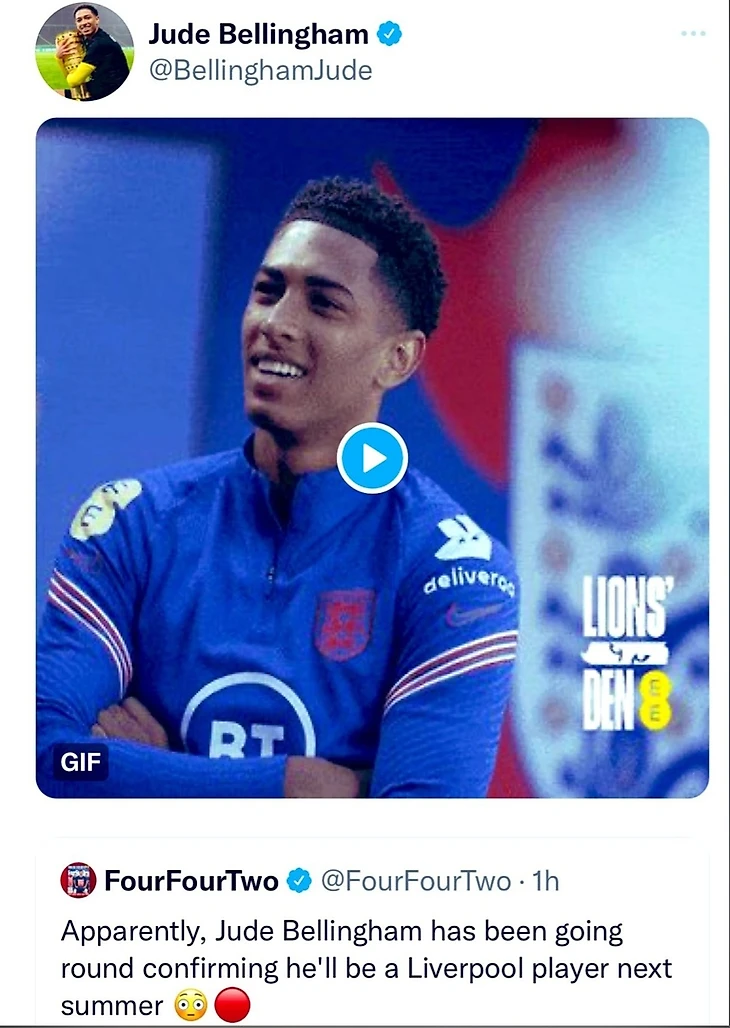 Недавно, бывший полузащитник «Мидлсбро» и выпускник академии «Ливерпуля», Крэйг Хигнетт сказал «BBC» следующее: «Я слышал из достоверных источников, что Беллингем связывался с красными. Не знаю, в январе или в конце сезона, но это почти свершенное дело» Ответ Джуда не заставил себя долго ждать. Англичанин в своем твитере просто выложил видео, где он смеется в форме сборной. Однако почти сразу удалил этот твит, скорее всего, по этическим соображениям.