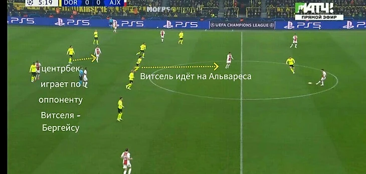 - На Альвареса (опорник «Аякса») выдвигался, когда он получал мяч, один из полузащитников «БД» - либо Брантд, либо Витсель. Тиггес(нападающий) часто старался прессинговать, закрывая тенью именно Альвареса, но не всегда получалось - в такие моменты были важны выдвижения одного из полузащитников в помощь.