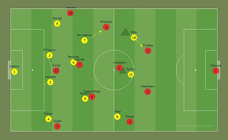 Беллингем прекрасно играл по Мазрауи, а Витсель - по Бергейсу. Им удалось обороняться против них.