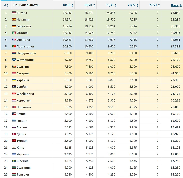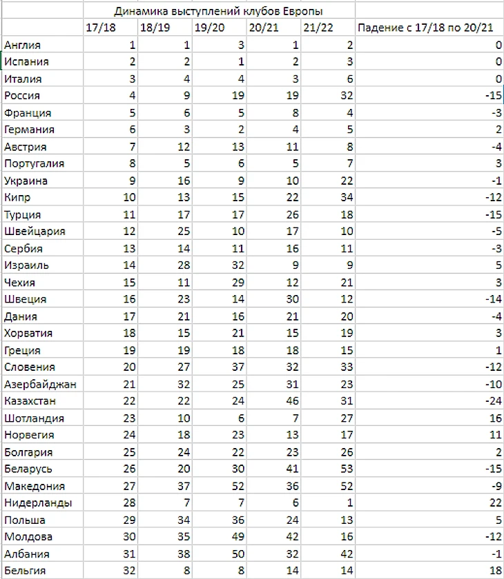 В этом сезоне российские клубы как никогда близки к провалу. На данный момент общая сумма баллов за сезон 2,9. Это 32-ое место, аккурат между Литвой и Албанией. Безусловно, еще есть надежда, что Зенит обыграем Мальме на выезде, Спартак попытается отомстить Легии в Варшаве, а Локо совершит чудо и спустя 2 тура окажется выше Марселя или Лацио. При лучших вариантах Зенит выходит в плей-офф Лиги Европы, а Спартак и Локо в соответствующий раунд в Лиге Конференций. Проходят как можно дальше и набирают приличное количество очков в копилку ассоциации. Иначе Россия рискует потерять место в групповом этапе Лиги Чемпионов наш чемпион будет вынужден проходить квалификацию для участия в самом элитном турнире Старого Света. Давайте взглянем на то, на каком месте будет находится наша ассоциация, если этот еврокубковый сезон завершить прямо сейчас: