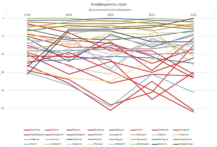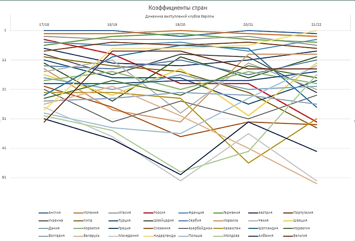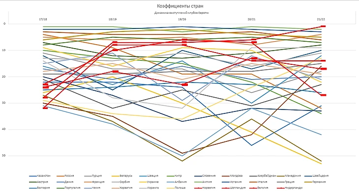 Для наглядности коэффициенты России выделены ярко-красным цветом. В сезоне 17/18 Россия заняла аж 4(!!!) место, пропустив вперед только таких столпов еврофутбола, как Англию, Испанию и Италию. Со следующего сезона эти результаты обнулятся и наши позиции знатно пошатнутся. Очевиден спад. Можно списать его и на вездесущий лимит, и на конкретные выступления наших клубов, но мне кажется, что в любом случае это явление является совокупностью многих факторов, некоторые из них мы рассмотрим в этой статье. Давайте рассмотрим какие еще ассоциации сильно упали за последние 5 сезонов(нынешний сезон пока не закончен, поэтому рассматривается падение с сезона 17/18 по 20/21).