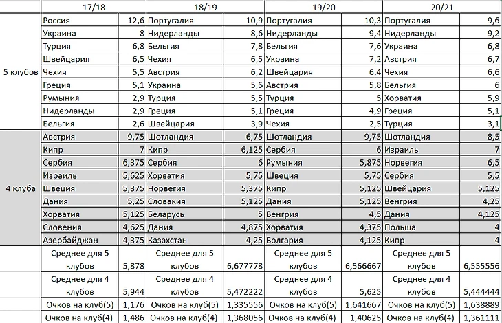 Рейтинг обновляется после каждого раунда клубных соревнований УЕФА." Официальный сайт УЕФА То есть, представим ситуацию, что Россия отправляет в Европу 5 клубов, а условная Швейцария 4. Каждое набранное очко России будет делиться на 5, а Швейцарии - на 4, соответственно. Им, естественно, проще набрать баллы. И это правильно. То есть, можно прийти к выводу, что лучше всех себя будут чувствовать те страны, у которых либо высокий средний уровень клубов(Англия, Испания, Германия, Италия), либо те, у кого есть 1-2-3 сильных клуба, которые стабильно хорошо выступают(Франция(ПСЖ), Португалия(Бенфика, Порту), Украина(Шахтер), Австрия(РБ Зальцбург) и т.д.). В идеале и то и то, это понятно. Давайте рассмотрим, сколько баллов набирают клубы, делегирующие 4 клуба в ЕК, а сколько - 5 клубов. И отдельно Россию. Это нам поможет убедиться в том, что действительно с 4 клубами легче подниматься в таблице.