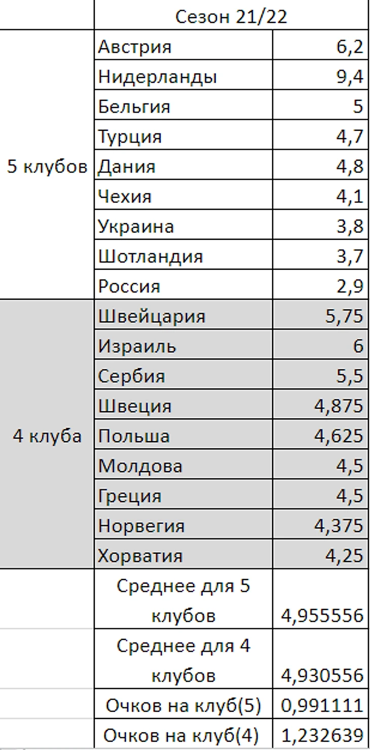 Разрыв по среднему числу очков отсутствует и может показаться, что нет никакой закономерности. Но стоит учесть тот факт, что в этом сезоне Аякс снова находится в сумасшедшей форме, одержав 4 победы в 4 турах Лиги Чемпионов. Без нидерландского оверперформанса разница будет уже в целый балл. А вот по средненабранному числу очков на клуб разница в 0,3 кажется более существенной. Но данный сезон еще даже не доигран до конца группового этапа, так что его показатели могут быть не столь объективны. Не будем забывать и про то, что появился новый турнир, Лига Конференций, где проще набирать очки странам, которые в ЛЧ и ЛЕ были в числе аутсайдеров. Рассмотрим предыдущие 4 сезона по такой же схеме, сколько в среднем набрали клубы, которые делегировали по 4 клуба и по 5 соответственно: