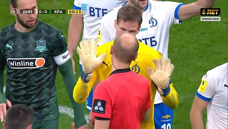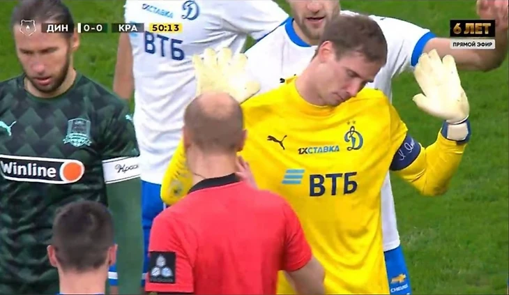 Шунин подбежал к арбитру и сказал, что руками не играл – и сразу успокоился, когда узнал, что ВАР смотрит эпизод. После этого капитан «Динамо» успокоил одноклубников.